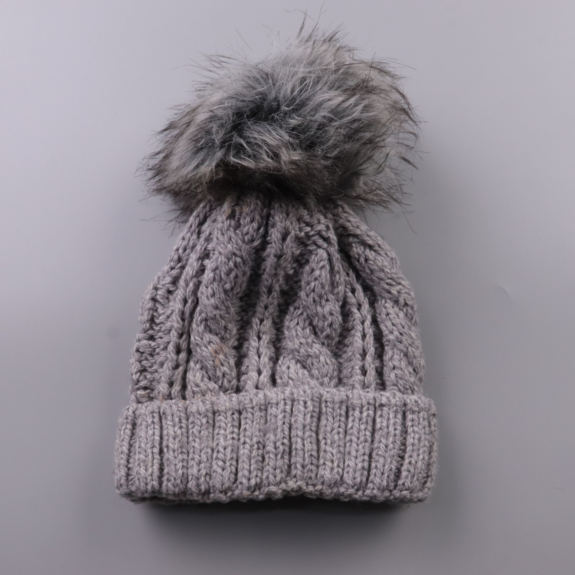 Вязаная шапка с помпоном без указания бренда, выполнена в сером цвете и с крупной вязкой «косы». Подойдёт для повседневной носки в холодную погоду, хорошо сочетается с пуховиком или пальто. Плотная вязка помогает сохранять тепло и прикрывает уши за счё...