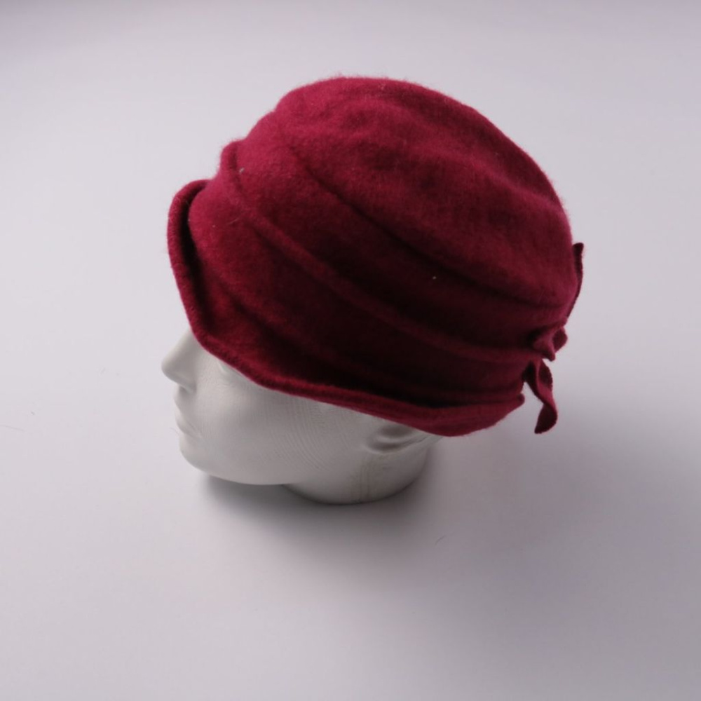 Бордовая шерстяная шапка без указанного бренда, мягкая и тёплая, с декоративным бантом сзади. Подойдёт для прохладной погоды и зимних прогулок, хорошо смотрится с пальто и шубой. Натуральная шерсть отлично удерживает тепло и защищает от ветра.