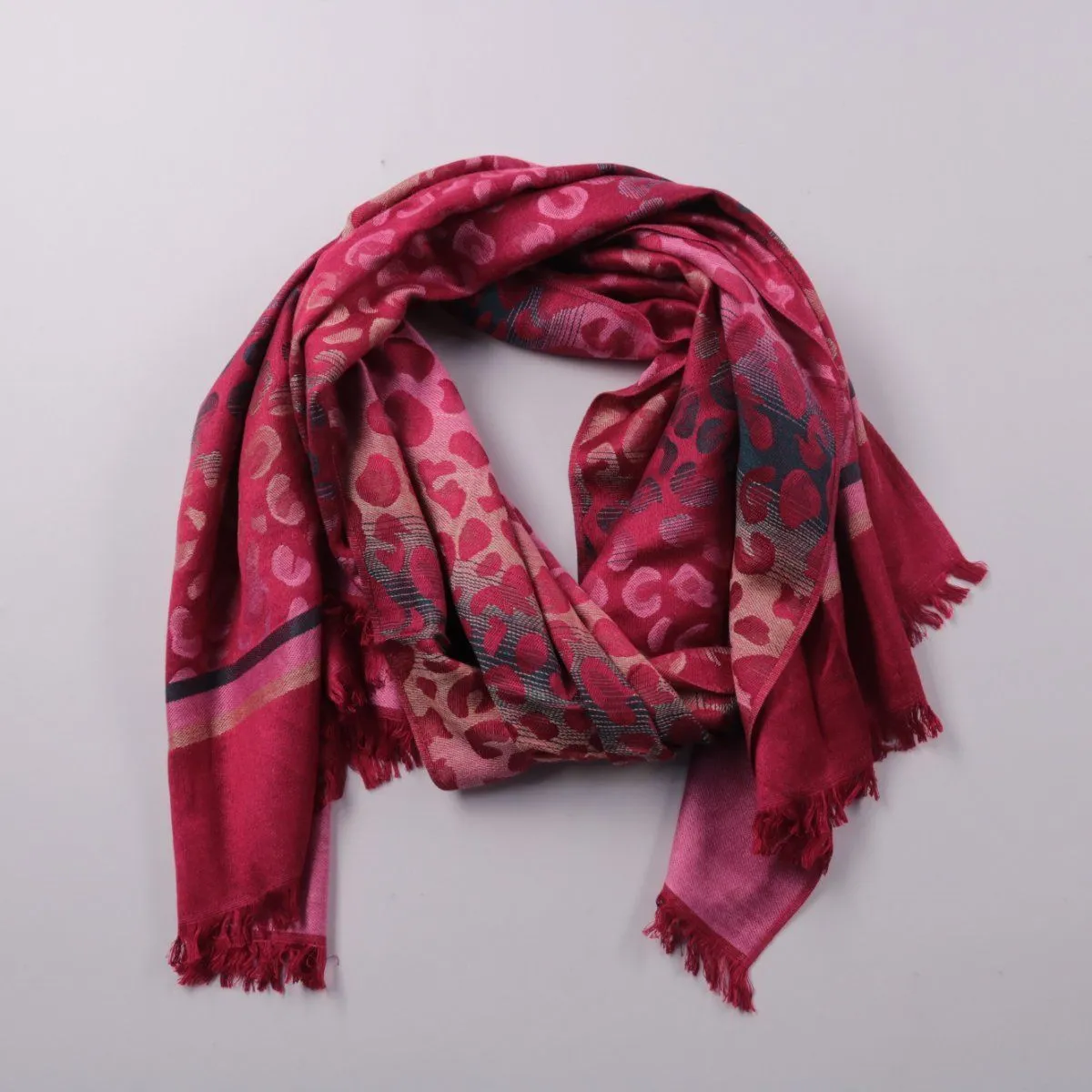 Шарф Fashion с леопардовым принтом в розово-бордовой гамме и бахромой по краям. Подойдёт для повседневных образов и как яркий акцент к однотонной верхней одежде. Мягкий материал легко драпируется и удобно завязывается.