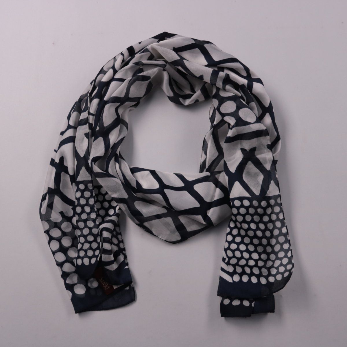 Шарф Dents с геометрическим принтом в сине-бело-серой гамме. Подойдёт для повседневных образов и как акцент к однотонной верхней одежде. Лёгкий материал удобно драпируется и быстро сохнет.
