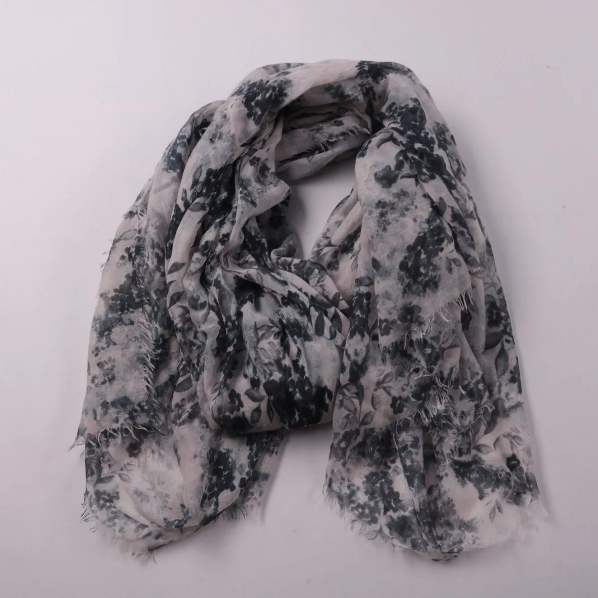 Шарф с цветочным принтом в серо-чёрной гамме и мягкой бахромой по краям. Подойдёт для повседневных образов в прохладную погоду и как лёгкий акцент к однотонной верхней одежде. Легко драпируется и не занимает много места в сумке.