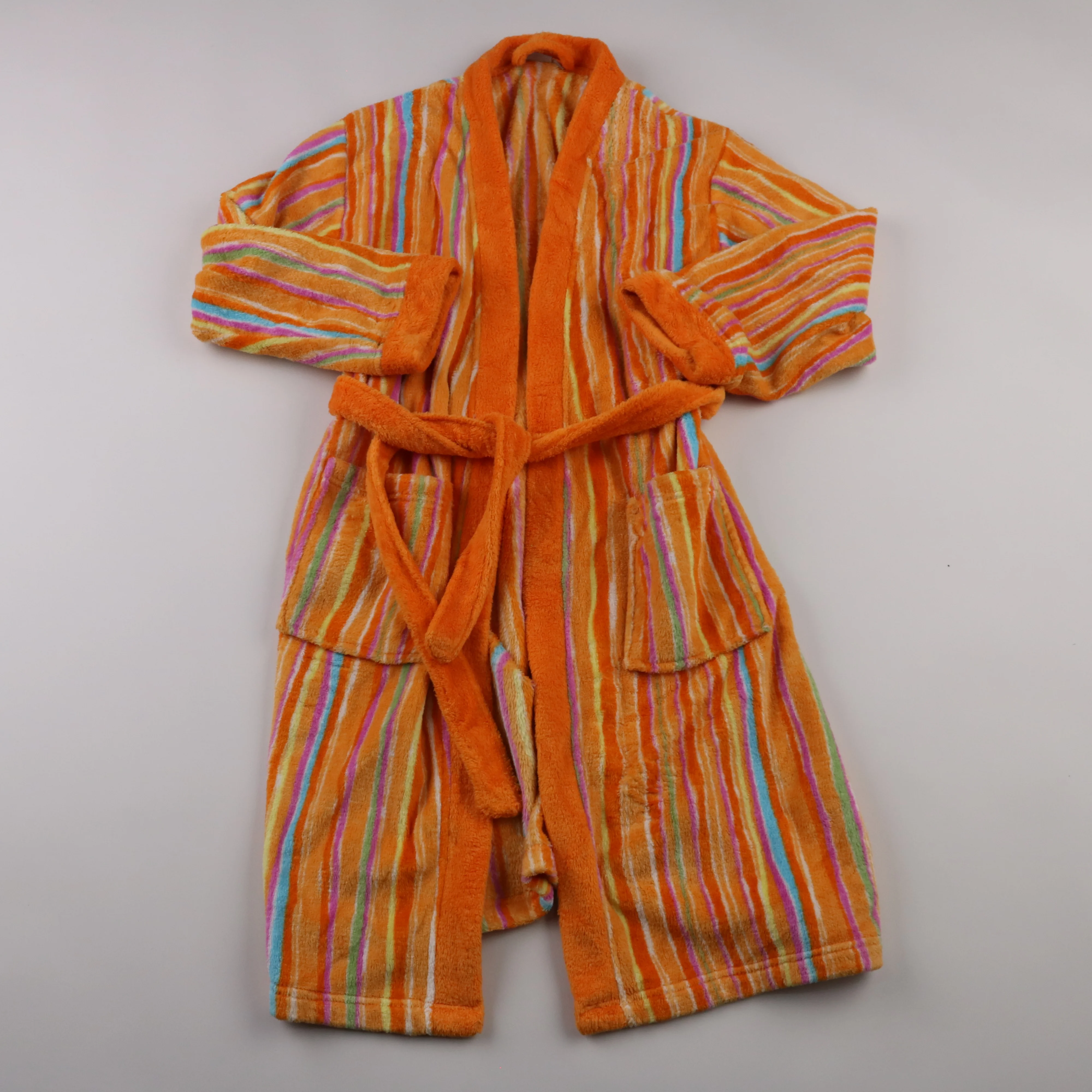 Детский махровый халат Poco PIANO в яркую разноцветную полоску, с поясом и двумя накладными карманами. Подойдёт для дома, бассейна или после душа, мягкая ткань приятно впитывает влагу и быстро согревает.