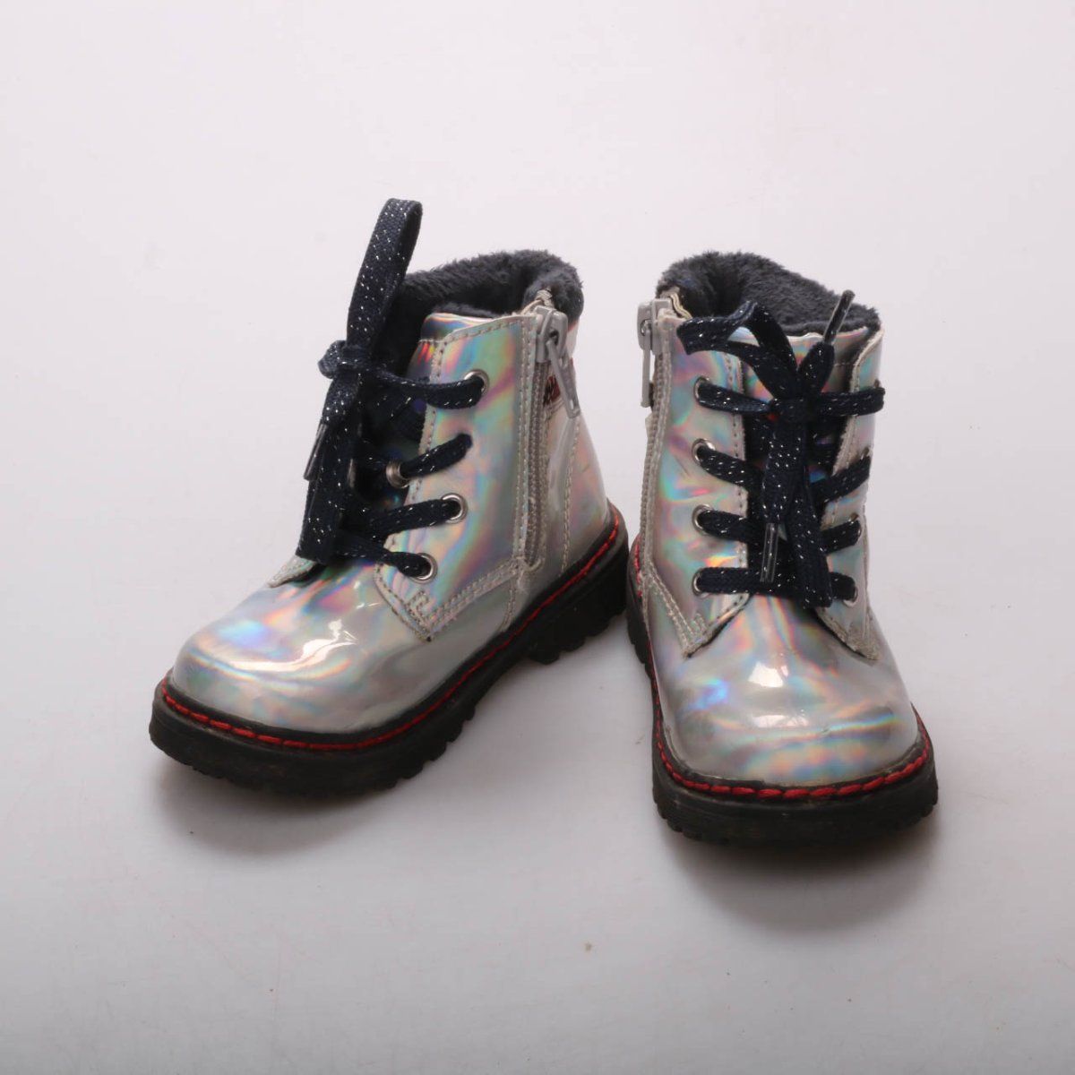 Детские ботинки Tom Tailor с голографическим серебристым верхом, шнуровкой и боковой молнией. Подойдут для холодной погоды в межсезонье и зимой благодаря тёплой подкладке. Плотная рифлёная подошва помогает увереннее ходить на улице.
