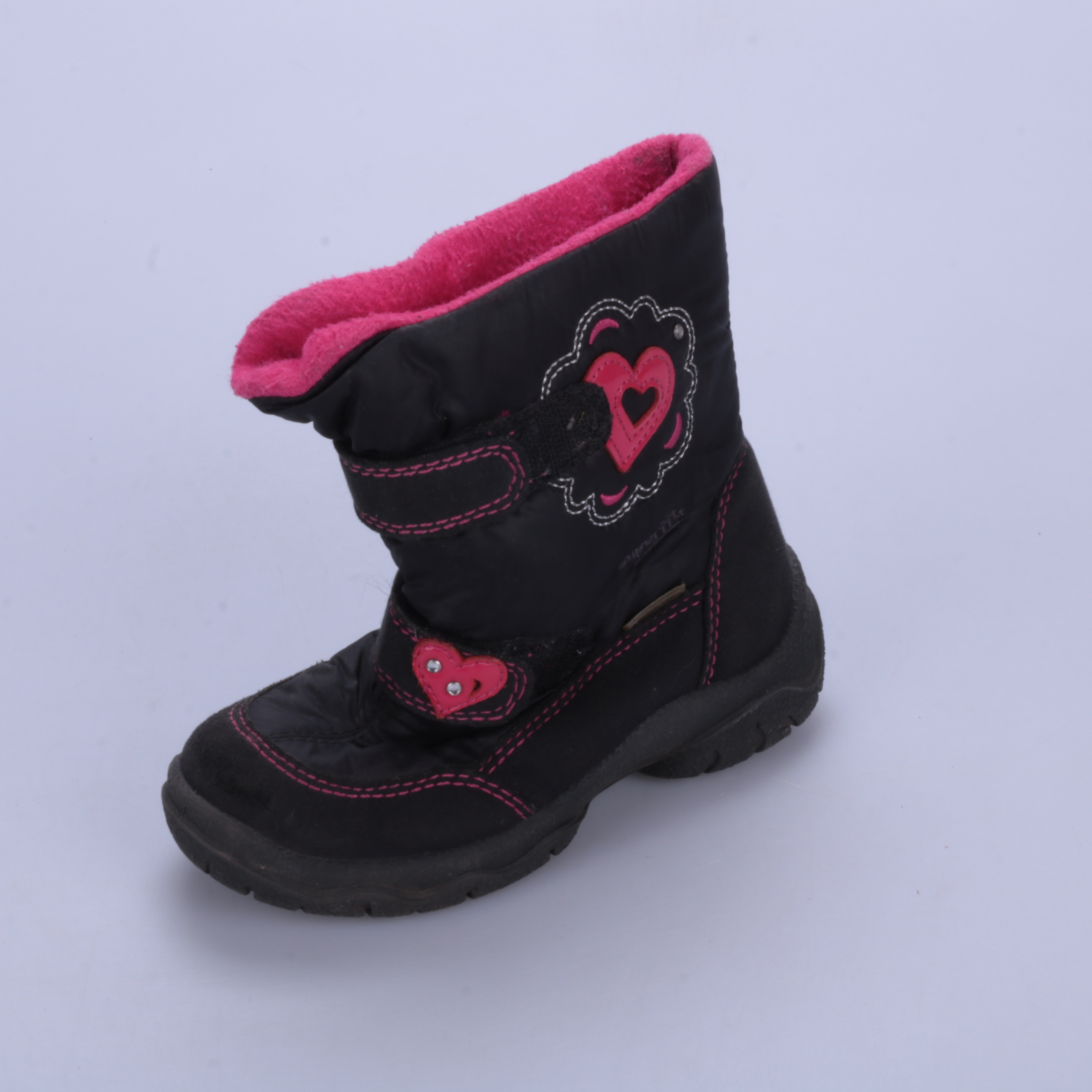 Зимние сапоги Superfit для девочки в чёрном цвете с яркой розовой подкладкой и декоративными сердечками. Подойдут для прогулок в холодную погоду, фиксируются на липучках и легко надеваются. Рельефная подошва помогает меньше скользить на снегу и слякоти.