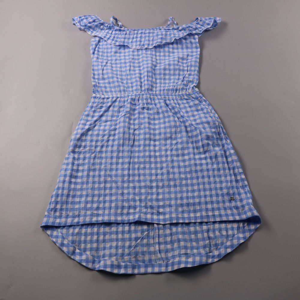 Платье Esprit в голубую клетку с открытыми плечами и воланом. Подойдёт для лета и отдыха, удобно сидит за счёт резинки на талии. Хлопковая ткань хорошо дышит и быстро сохнет после стирки.