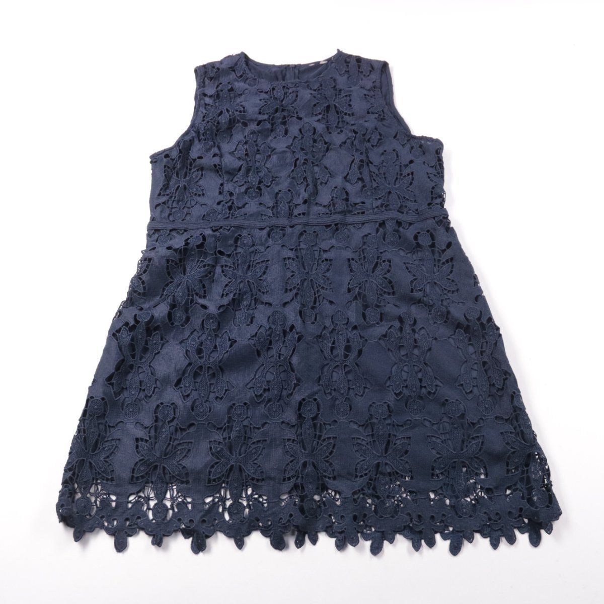 Детское платье без бренда, тёмно-синего цвета, с ажурным кружевным верхом и фигурным краем по низу. Подойдёт для праздников, утренников и фотосессий, хорошо смотрится с балетками или туфлями. Лёгкое и не сковывает движения, удобно надевать поверх колготок.