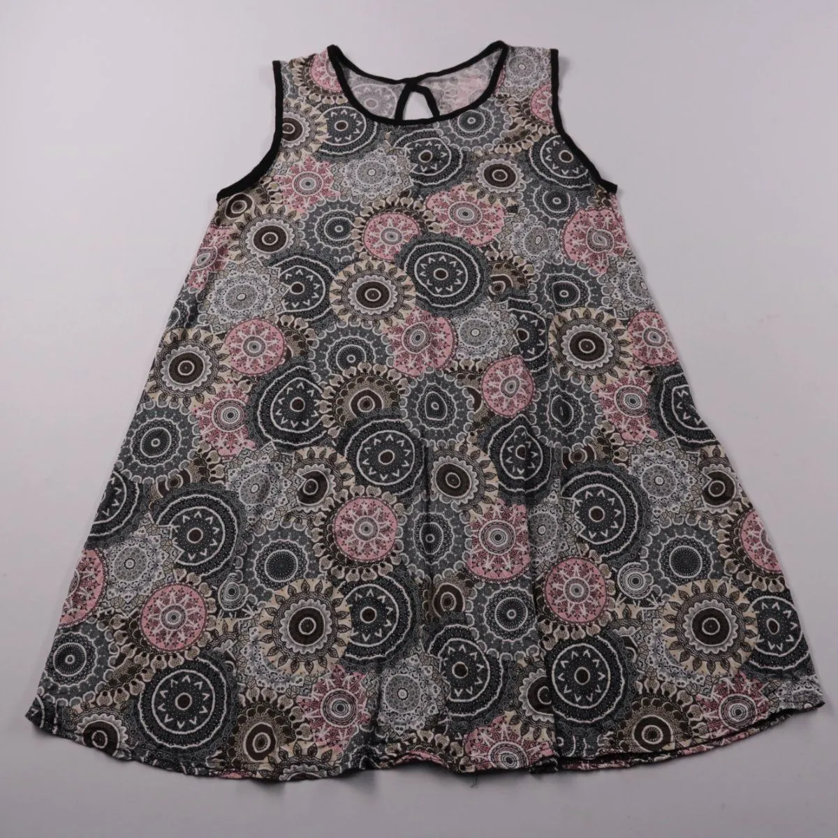 Платье для девочки с лёгкой расклешённой посадкой и принтом в виде круговых орнаментов. Подойдёт для прогулок и повседневной носки в тёплую погоду. Материал тянется и не стесняет движений.