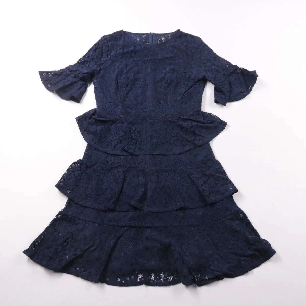 Платье без указанного бренда выполнено в тёмно-синем цвете с кружевным верхом и многоярусной юбкой. Подойдёт для праздников, утренников и семейных мероприятий в любое время года. За счёт подкладки платье комфортнее на теле и лучше держит форму.