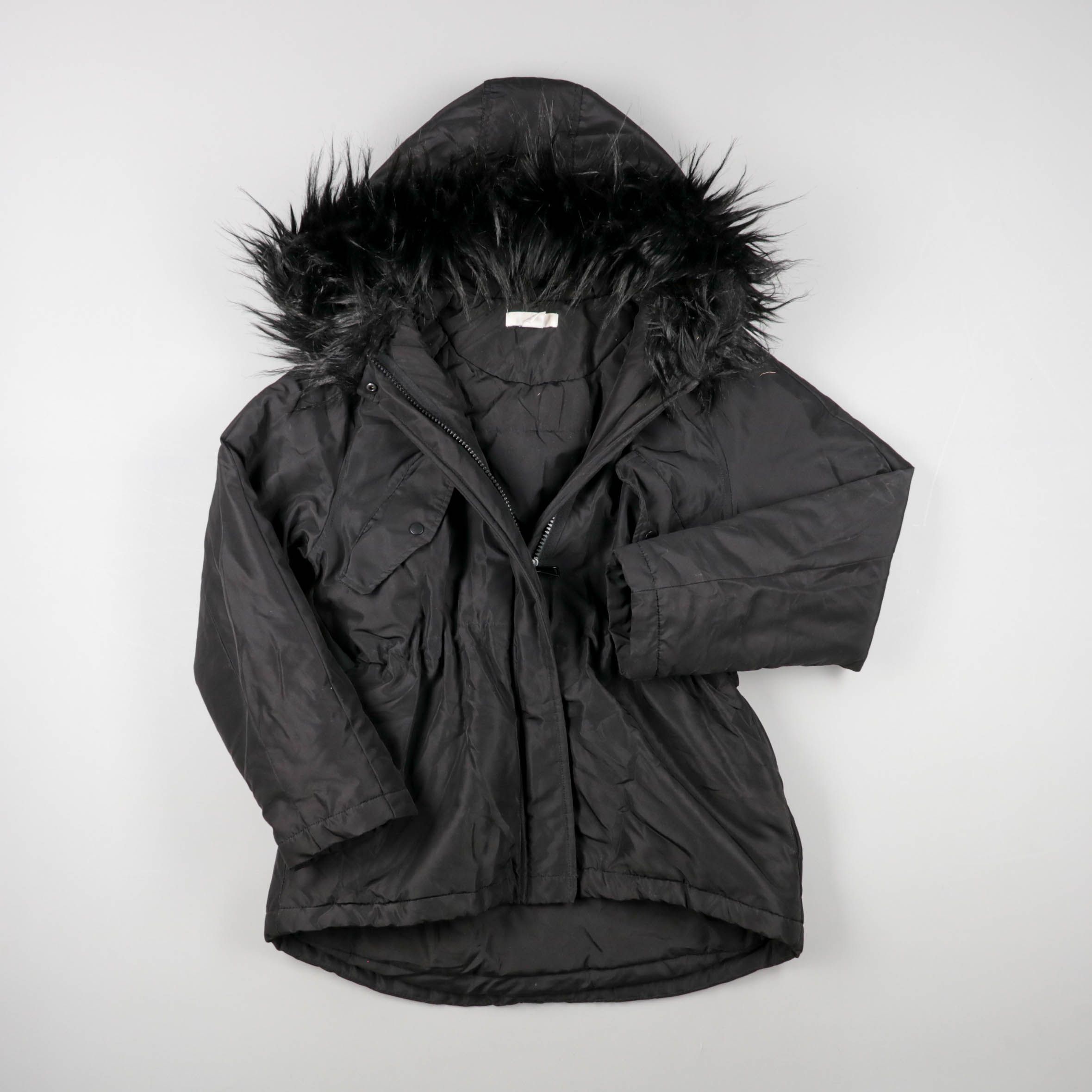 Утеплённая куртка с капюшоном и меховой окантовкой, подойдёт для прогулок в холодную погоду. Модель на молнии, хорошо закрывает шею и голову от ветра. Практичный тёмный цвет — немаркая и легко сочетается с любой одеждой.