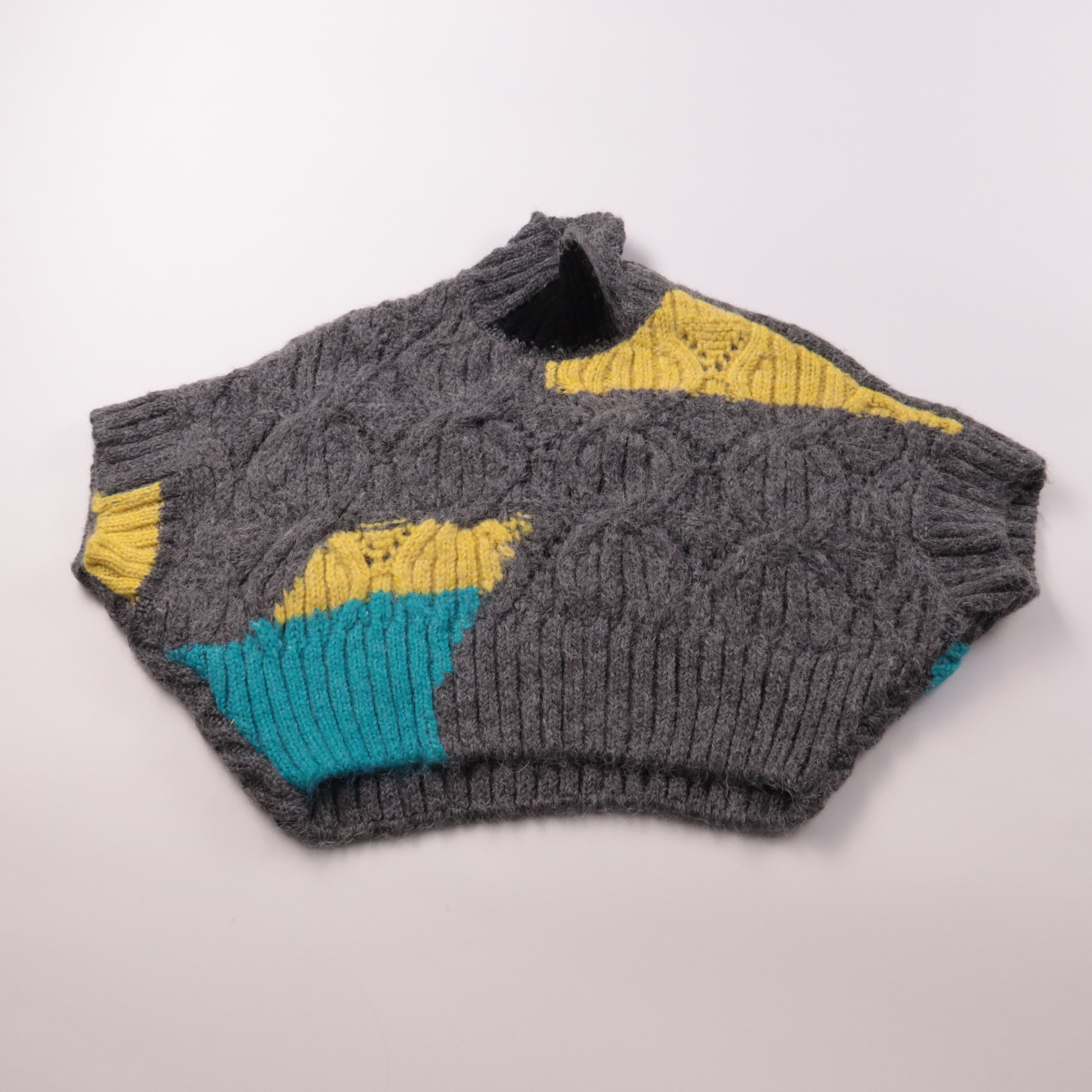 Вязаный свитер с фактурной вязкой «косы» и яркими вставками на сером фоне. Подойдёт для прогулок в холодную погоду и для детского сада, можно носить как самостоятельный слой или под куртку. Плотная вязка хорошо сохраняет тепло.