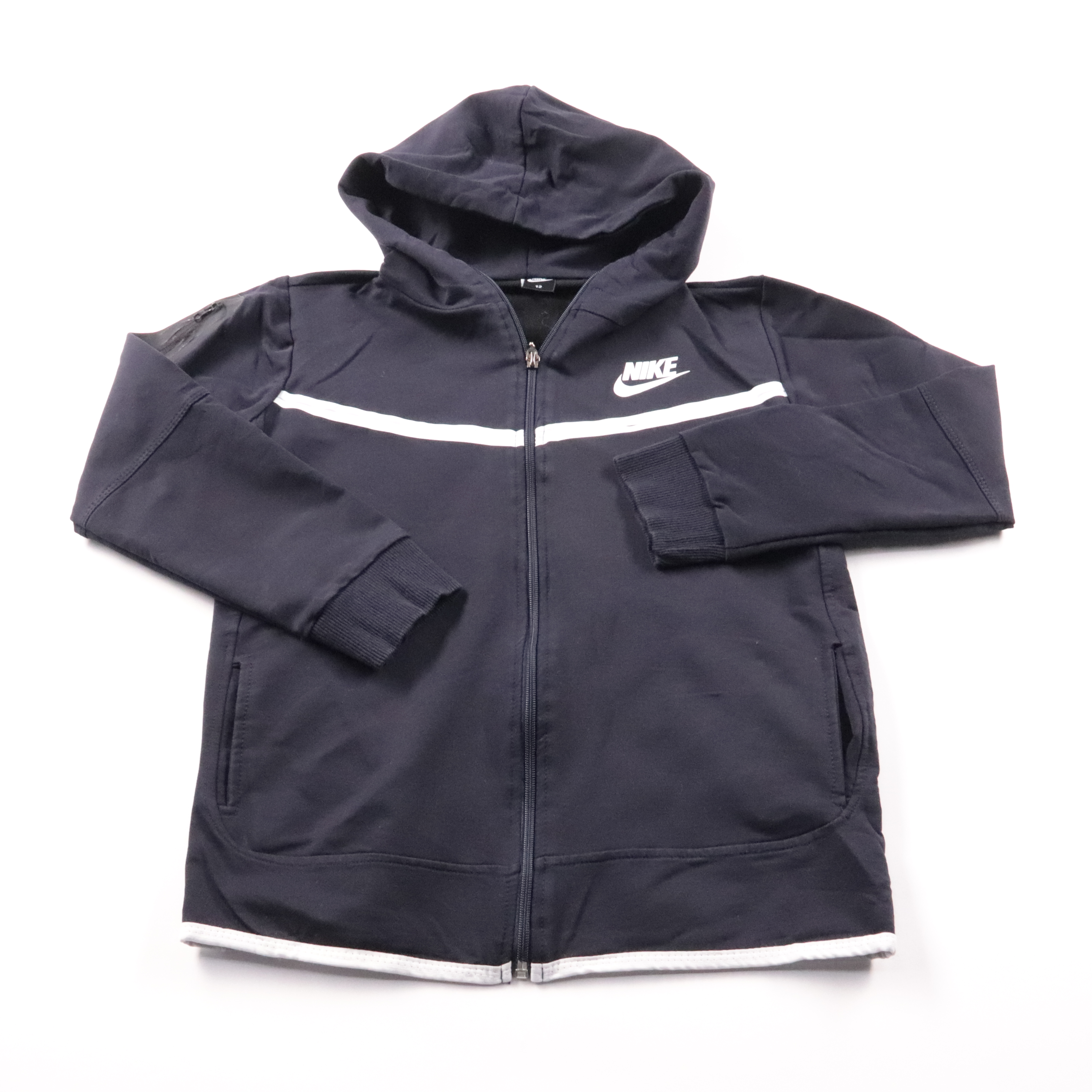 Толстовка Nike на молнии с капюшоном, тёмно-синего цвета с белой полосой и логотипом на груди. Подойдёт для школы, прогулок и спорта в прохладную погоду. Практичные карманы и застёжка-молния позволяют быстро надевать и удобно носить каждый день.
