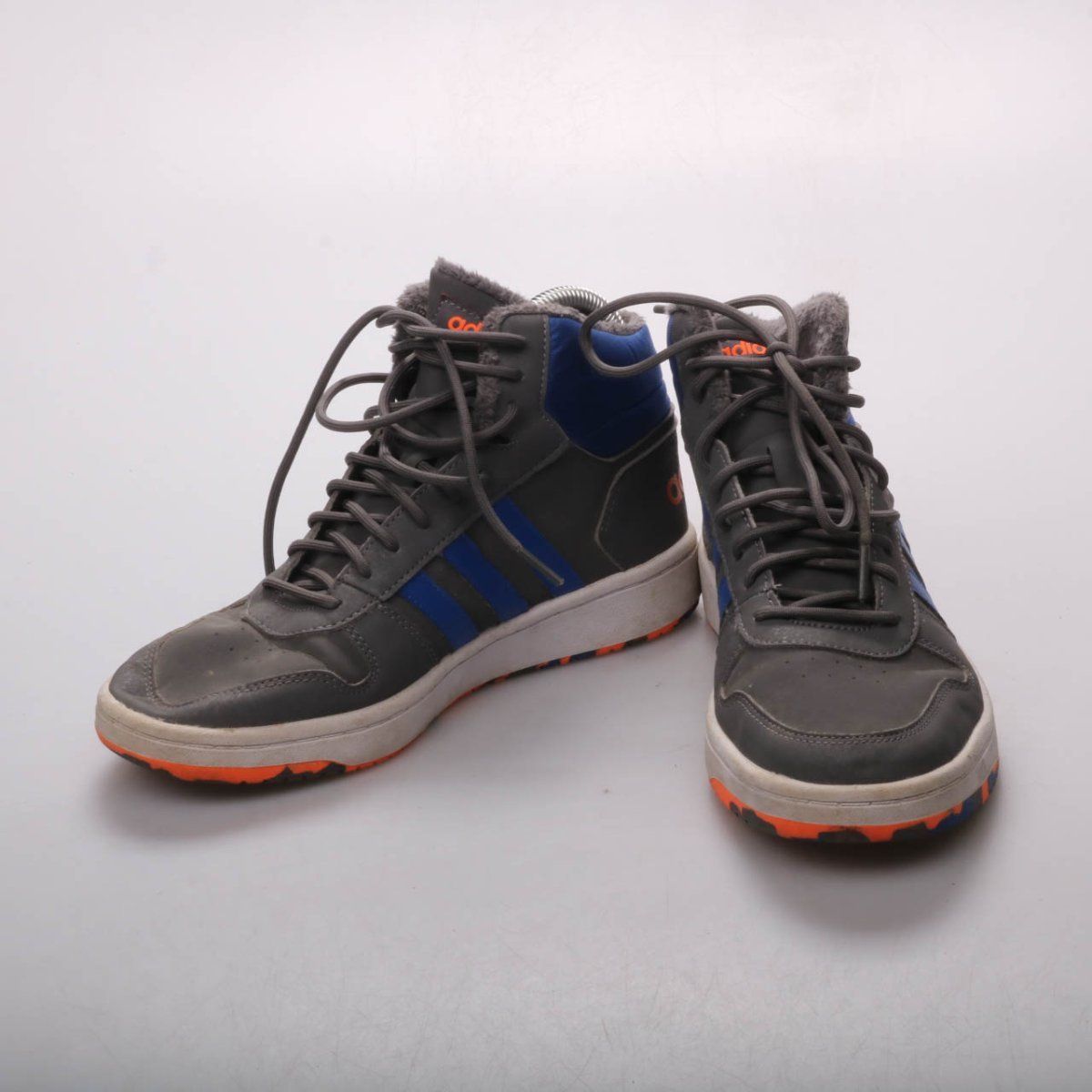 Высокие кроссовки adidas в сером цвете с синими полосами и утеплённой подкладкой. Подойдут для повседневной носки в холодную погоду и прогулок по городу. Рельефная резиновая подошва даёт более уверенное сцепление на мокрой и скользкой поверхности.