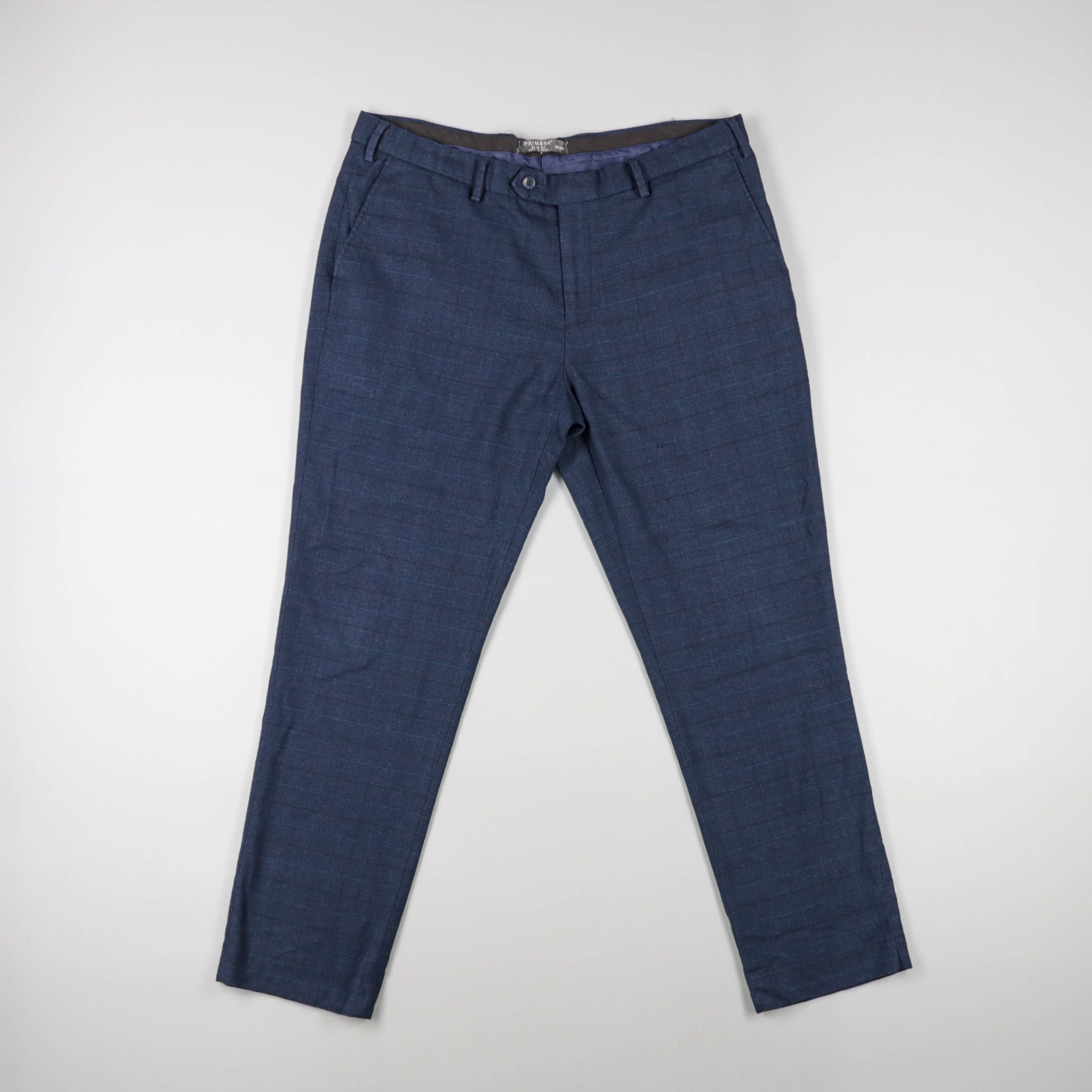 Мужские классические брюки Primark в синем цвете с тонкой клеткой и шлевками под ремень. Подойдут для офиса, деловых встреч и повседневных образов в smart casual. Практичный плюс — немаркий оттенок и ткань, которая хорошо держит форму.