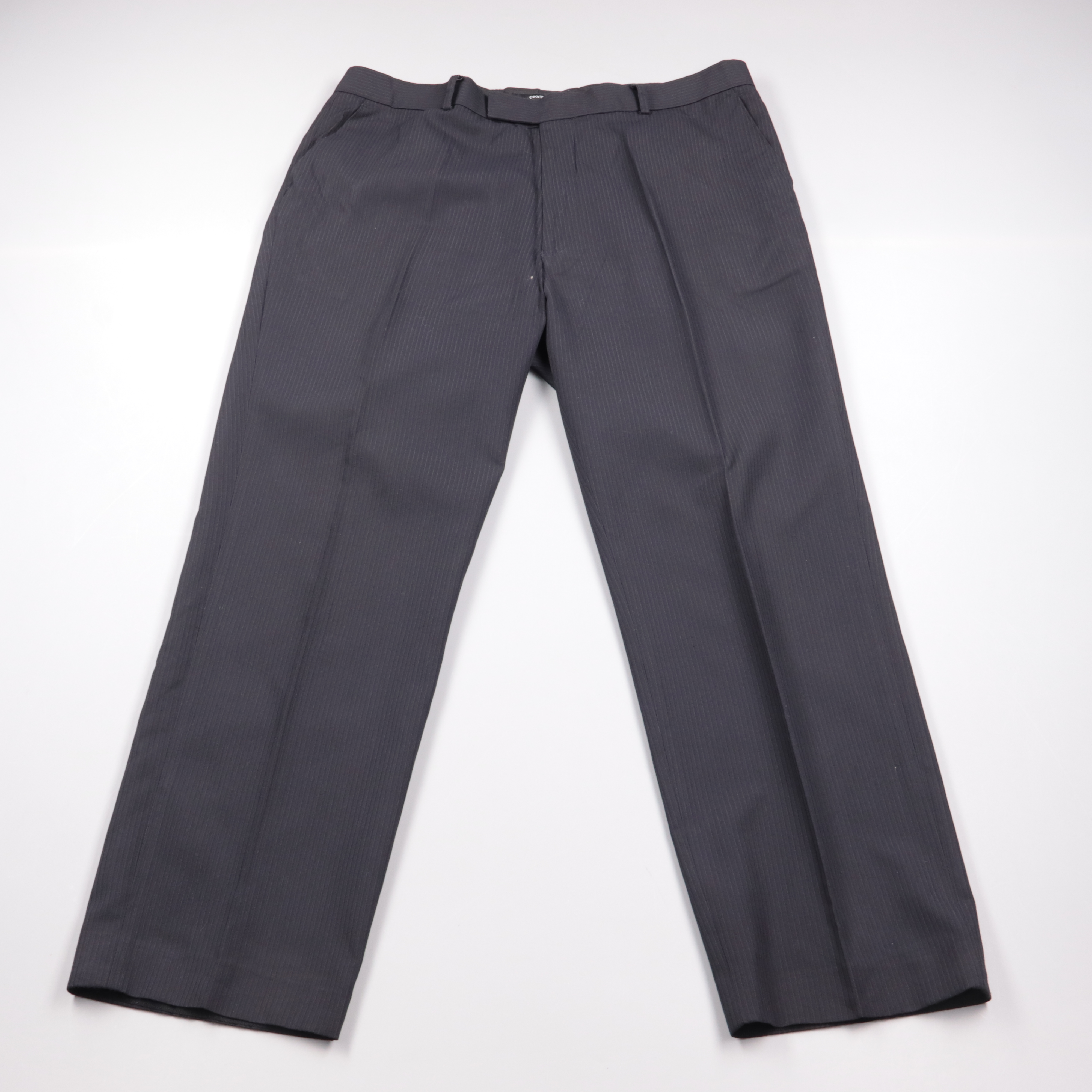Мужские классические брюки George тёмно-синего цвета в тонкую полоску, с застёжкой на молнию и шлёвками под ремень. Подойдут для офиса, деловых встреч и торжественных случаев, легко сочетаются с рубашкой и пиджаком. Практичный плюс — немнущаяся смесова...