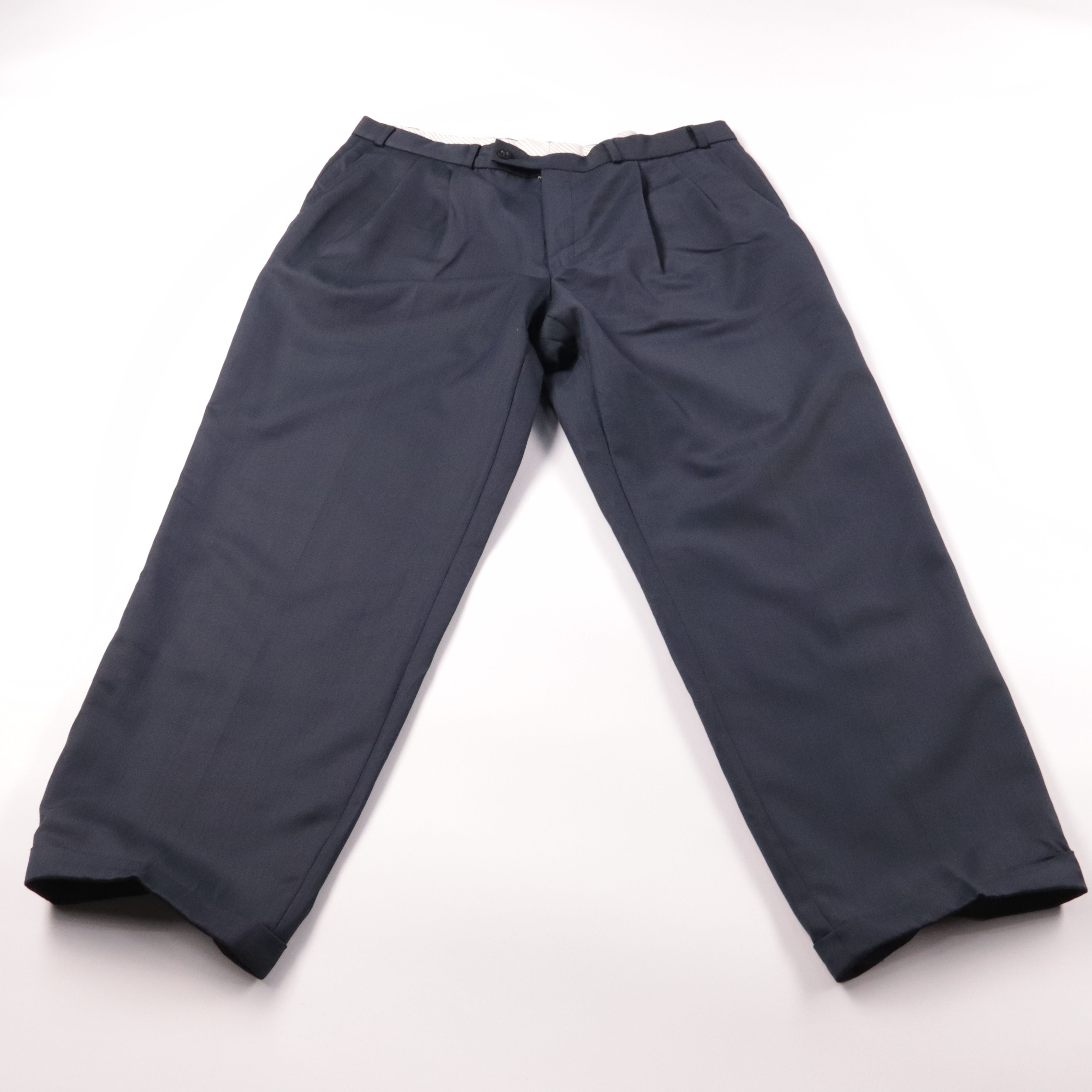 Мужские брюки классического кроя в тёмно-синем цвете, без явного бренда на фото. Подойдут для офиса и повседневных образов, хорошо сочетаются с рубашкой или джемпером. Практичны за счёт спокойного цвета и удобной посадки с шлёвками под ремень.