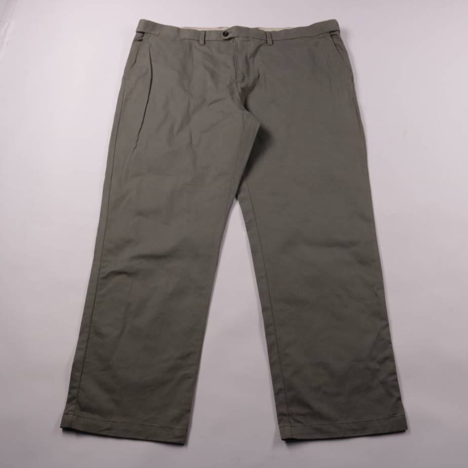 Мужские брюки M&S Collection Regular в спокойном серо-оливковом цвете, прямого кроя с застёжкой на пуговицу и молнию. Подойдут для офиса и повседневной носки в демисезон и круглый год. Практичный хлопковый материал хорошо дышит и легко стирается при 30°C.