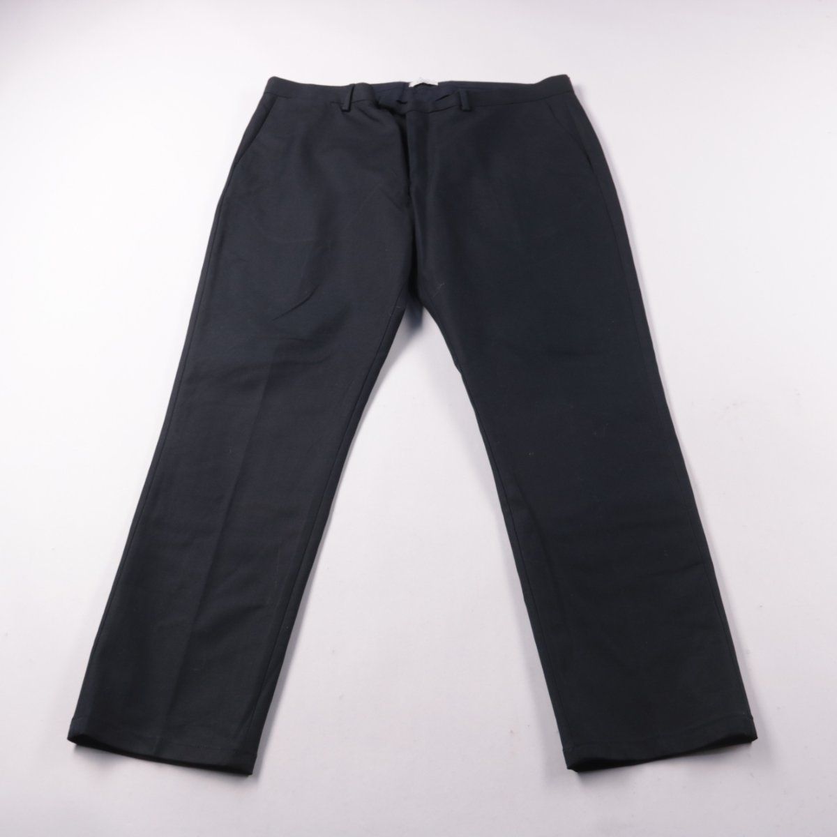 Мужские классические брюки Reiss тёмного цвета, выполнены из хлопка с добавлением эластана. Подойдут для офиса и повседневных образов, хорошо держат форму. Материал немного тянется, поэтому комфортны в носке.
