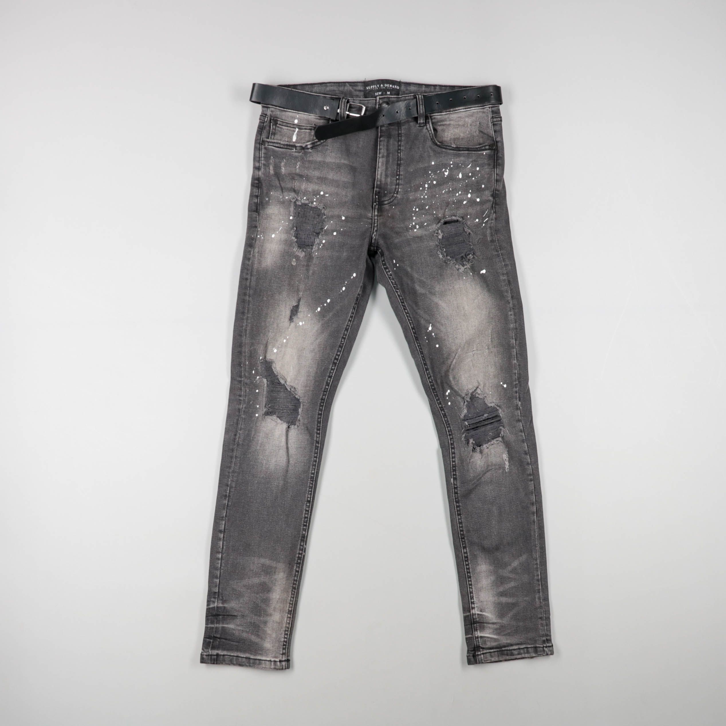 Мужские джинсы неуказанного бренда в сером цвете с потертостями, декоративными разрывами и эффектом брызг. Подойдут для повседневных и streetwear-образов с кедами или ботинками. Плотный деним практичен в носке и хорошо сочетается с базовыми вещами.