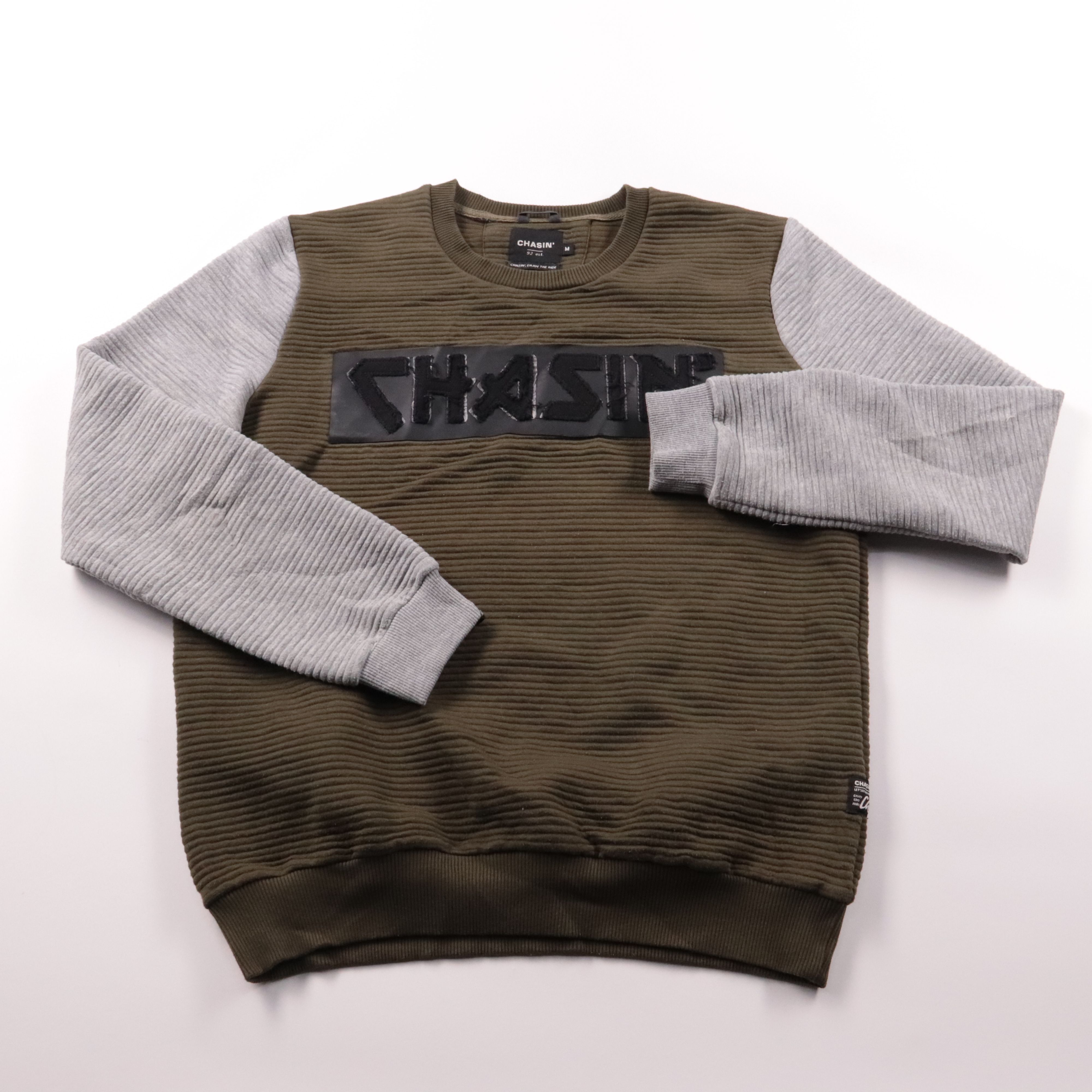 Мужской свитшот Chasin' в цвете хаки с серыми рукавами и фактурной тканью в рубчик, спереди объёмный логотип. Подойдёт для повседневной носки в прохладную погоду и для многослойных образов. Плотный материал держит форму и не так быстро мнётся.