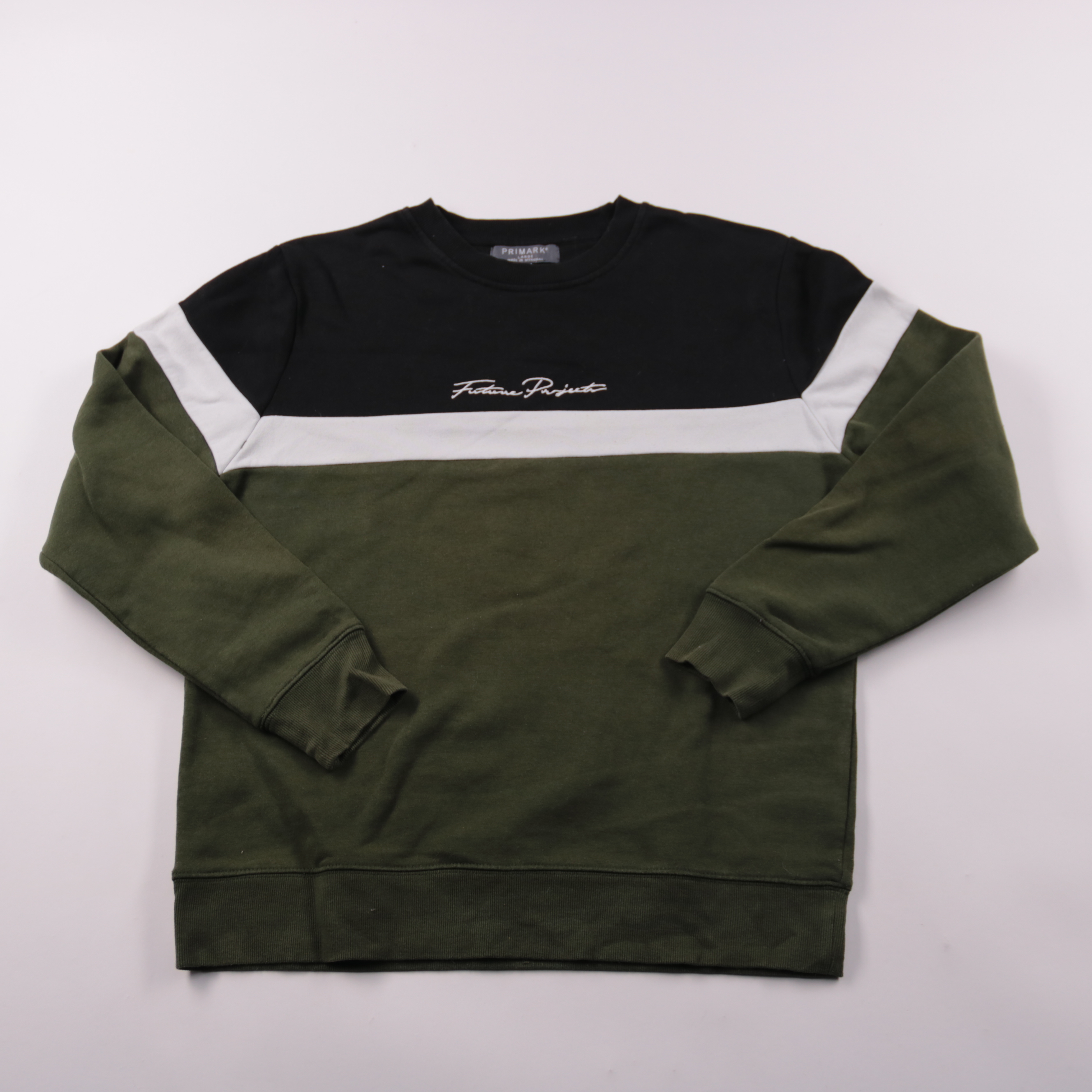 Мужской свитшот Primark в стиле колор-блок: чёрный верх, белая вставка и оливковый низ, спереди небольшая надпись. Подойдёт для повседневной носки в прохладную погоду и для прогулок. Плотный хлопковый футер с добавлением полиэстера хорошо держит форму ...