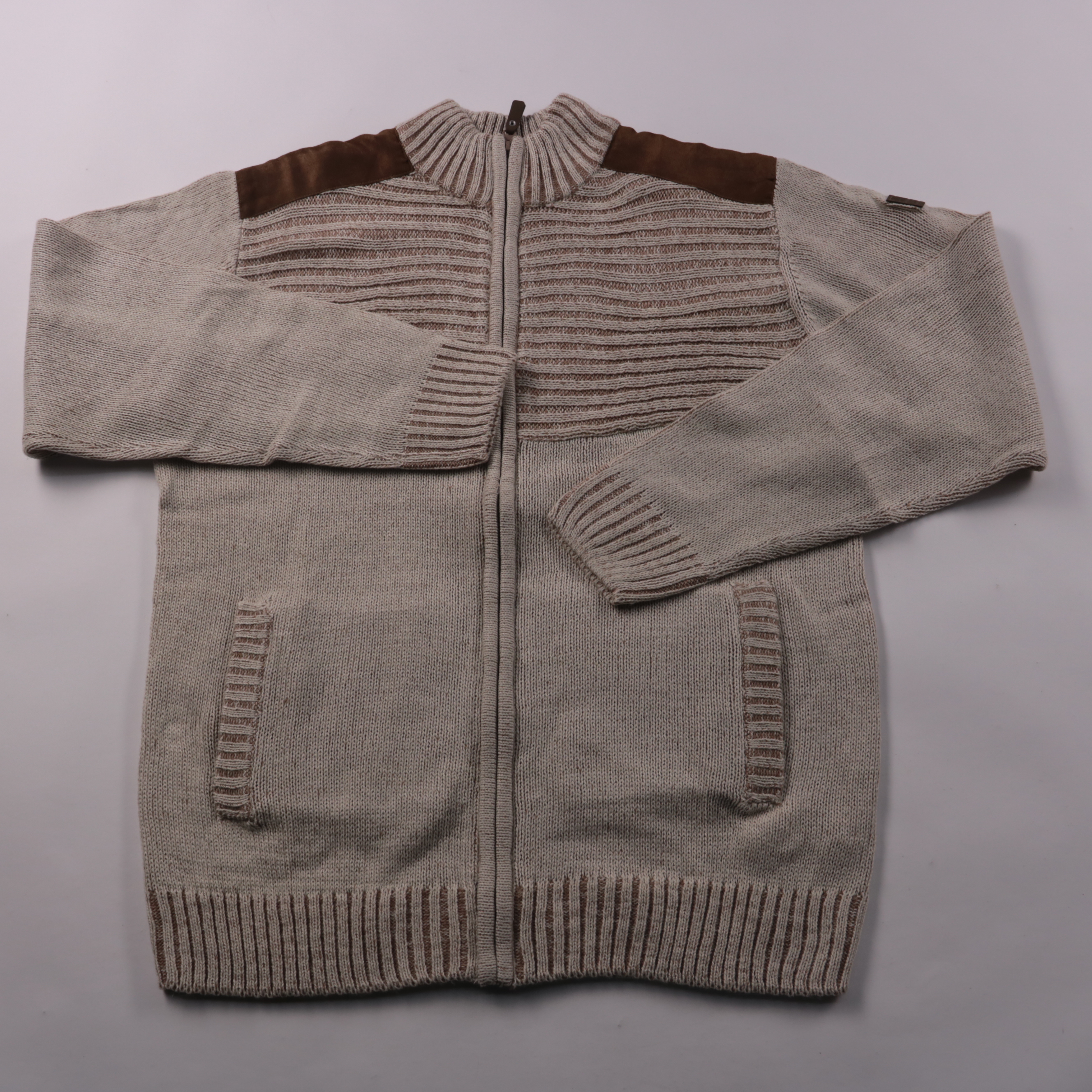 Мужской кардиган Atlas for men на молнии с высоким воротником и накладками на плечах. Подойдёт для повседневной носки в прохладную погоду и в качестве второго слоя. Практичный плюс — два передних кармана и удобная застёжка-молния.