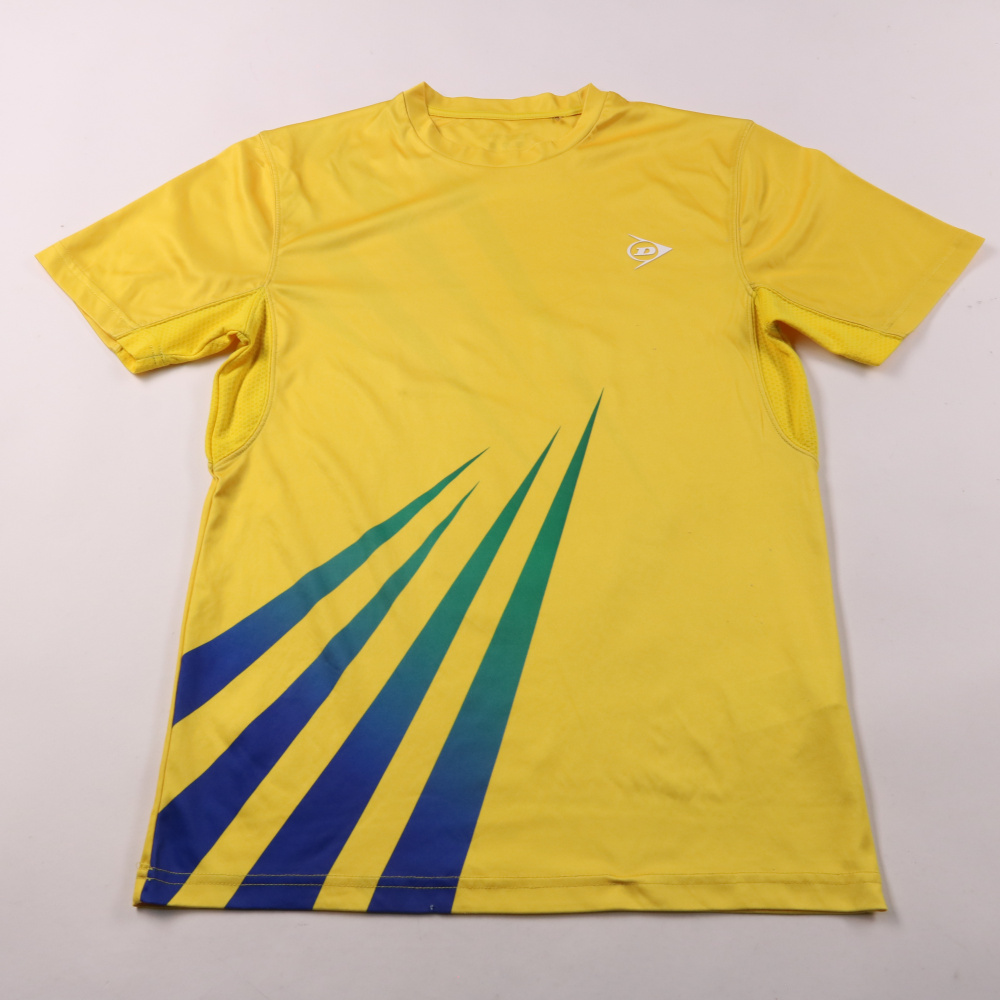 Спортивная футболка Dunlop жёлтого цвета с графическим принтом и сетчатыми вставками по бокам. Подойдёт для тренировок, бега и активного отдыха. Лёгкий синтетический материал быстро сохнет и хорошо отводит влагу.