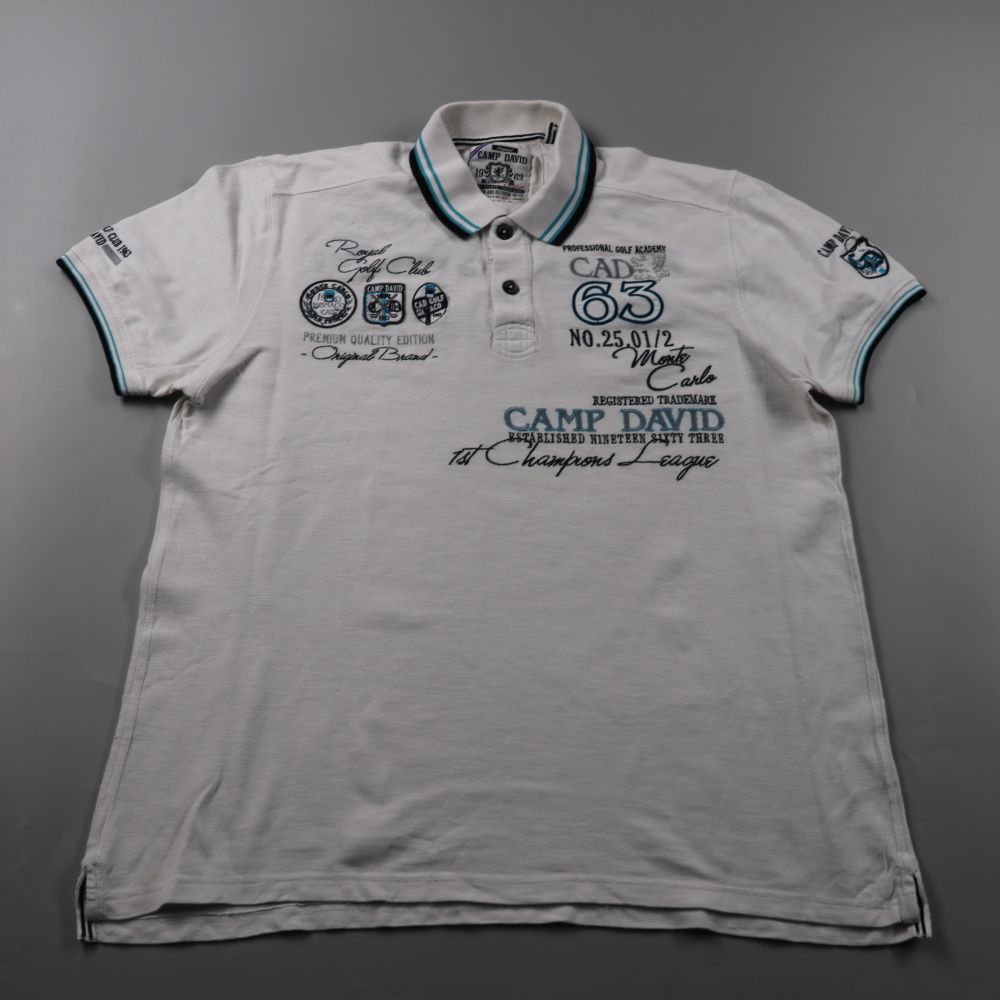 Мужское поло Camp David белого цвета с контрастной окантовкой и фирменными вышивками/принтами. Подойдёт для повседневной носки летом и в тёплую погоду, хорошо смотрится с джинсами или шортами. Хлопковый пике комфортно дышит и не требует сложного ухода.