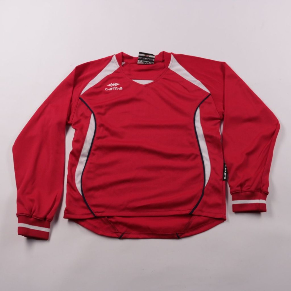 Спортивная футболка с длинным рукавом Cama красного цвета с белыми вставками, подойдёт для тренировок и активных игр. Лёгкий синтетический материал быстро сохнет и не сковывает движения.