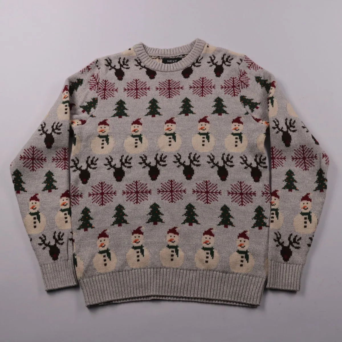 Мужской свитер Next с новогодним жаккардовым узором (снеговики, олени и ёлки) на сером фоне. Подойдёт для зимы и праздничных встреч, хорошо смотрится с джинсами или брюками. Плотная вязка из хлопка с акрилом тёплая и проста в уходе.