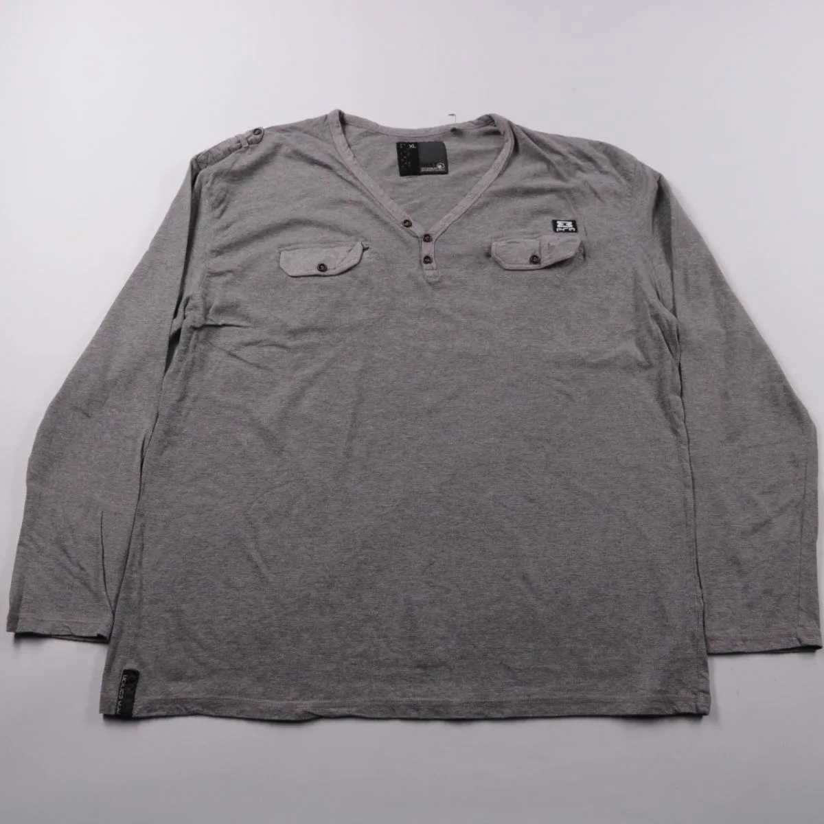 Мужской серый лонгслив Next с V-образным вырезом на пуговицах и двумя нагрудными карманами. Подойдёт для повседневной носки и как базовый слой в прохладную погоду. Ткань с хлопком приятная к телу и проста в уходе.
