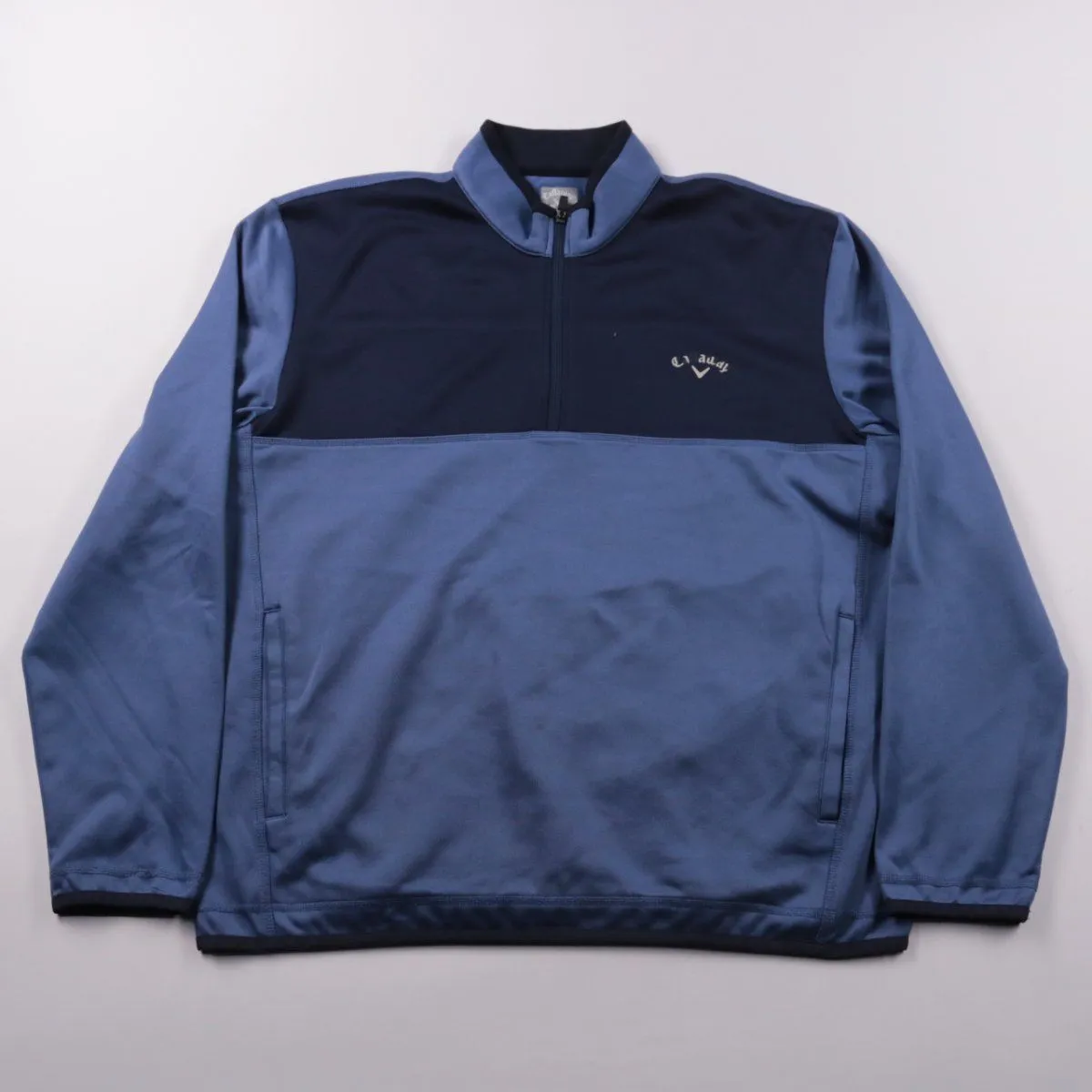 Мужская спортивная толстовка Callaway с короткой молнией и воротником-стойкой, выполнена в двух оттенках синего. Подойдёт для прогулок, спорта и активного отдыха в прохладную погоду, удобно носить как второй слой. Практичный плюс — лёгкий и быстро сохнущий материал из полиэстера, простой в уходе.