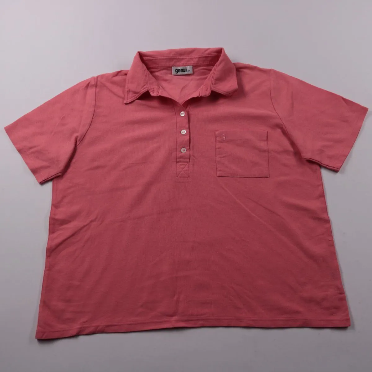 Мужское поло Gerwi розового цвета с коротким рукавом и планкой на пуговицах, есть нагрудный карман. Подойдёт для повседневной носки и тёплой погоды, можно носить с джинсами или шортами. Практичный плюс — смесовый состав (хлопок/полиэстер) легче в уходе и меньше мнётся.