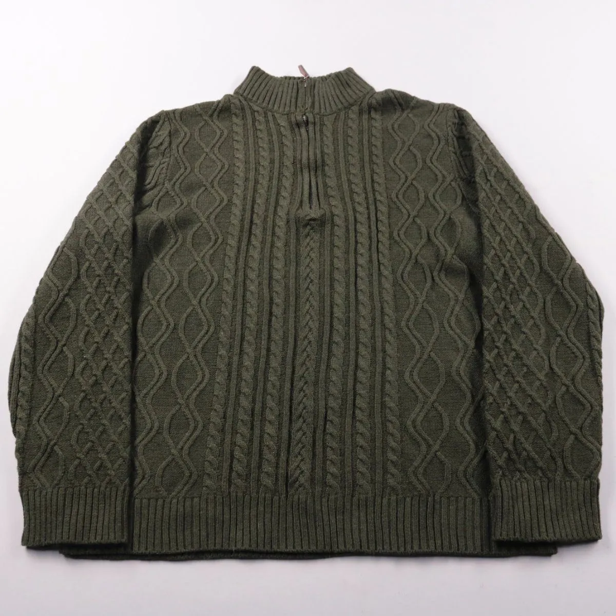Мужской вязаный джемпер с высоким воротником на короткой молнии и рельефным узором «косы». Подойдёт для повседневной носки в прохладную погоду и под куртку/жилет. Плотная вязка хорошо держит форму и добавляет тепла.