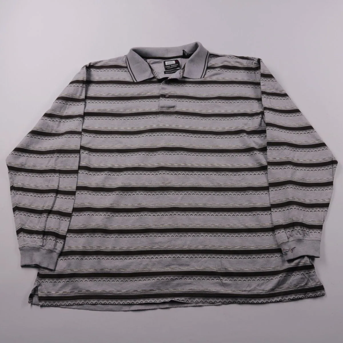 Мужское поло Greg Norman Collection с длинным рукавом и воротником на пуговицах, в серую полоску. Подойдёт для повседневной носки и в стиле casual/golf. Мерсеризованный хлопок приятен к телу и хорошо держит форму.