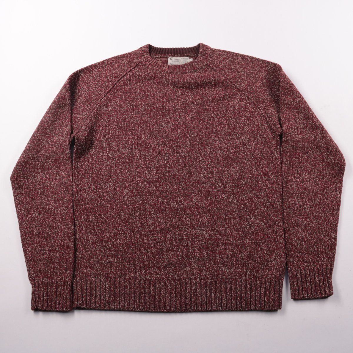 Мужской свитер Tu из фактурного меланжевого трикотажа бордового цвета, с круглым вырезом и рукавом реглан. Подойдёт для повседневных образов в прохладную погоду, хорошо сочетается с джинсами и брюками. Практичный плюс — плотная вязка и широкие манжеты/низ держат форму.