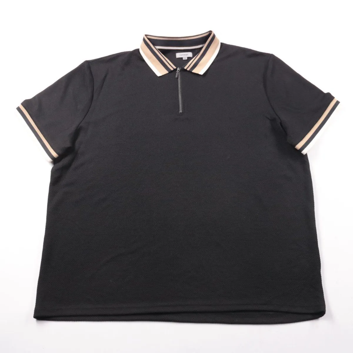Мужское поло George чёрного цвета с коротким рукавом и воротником на молнии. Подойдёт для повседневной носки и офиса в стиле casual, благодаря аккуратной контрастной отделке на воротнике и манжетах. Ткань с добавлением эластана немного тянется и комфортна в движении.