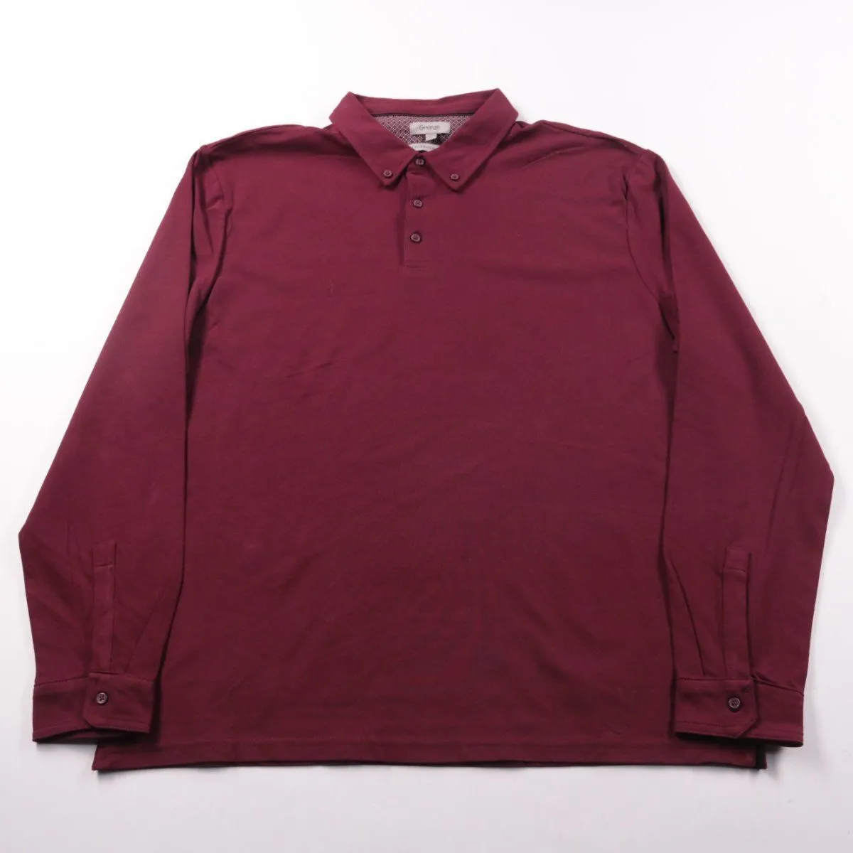 Мужское поло George из мерсеризованного хлопка бордового цвета, с длинным рукавом и воротником на пуговицах. Подойдёт для офиса в стиле casual и повседневной носки в прохладную погоду. Ткань с добавлением эластана лучше тянется и комфортно садится по фигуре.