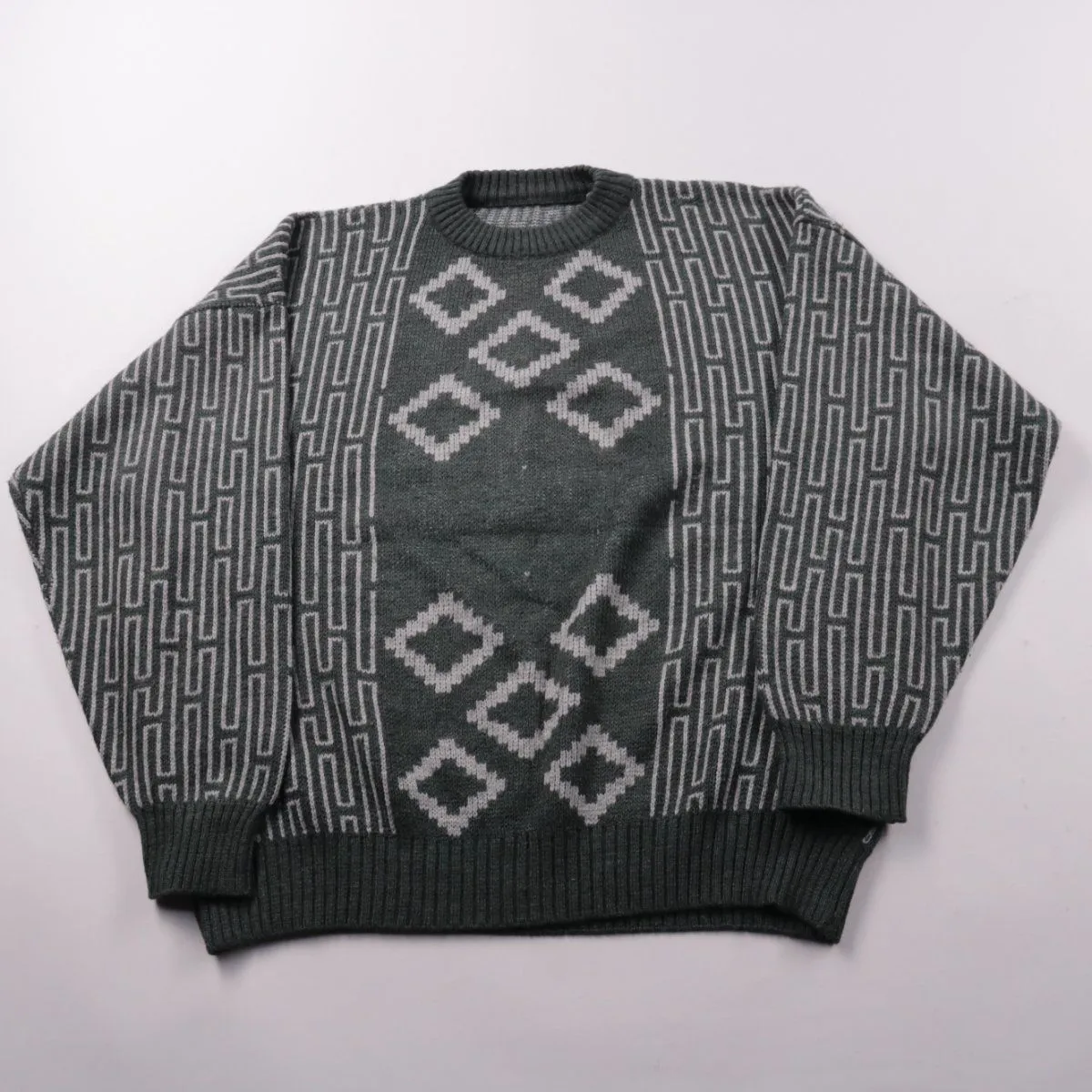 Вязаный мужской джемпер с круглым вырезом и геометрическим узором в серо-зелёной гамме. Подойдёт для повседневной носки в прохладную погоду и для многослойных образов. Плотная вязка хорошо удерживает тепло.