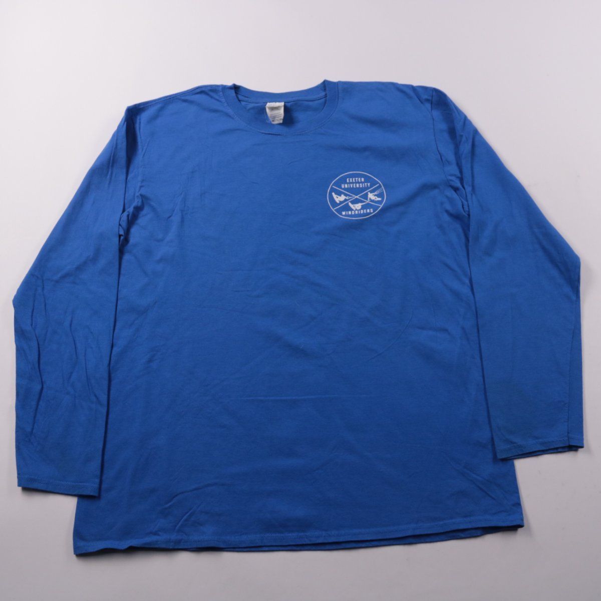 Мужская футболка с длинным рукавом Gildan Softstyle из хлопка, синего цвета с белым принтом Exeter University Windriders. Подойдёт для повседневной носки, учёбы или спорта в прохладную погоду. Практична тем, что легко комбинируется с джинсами и спортивными брюками.