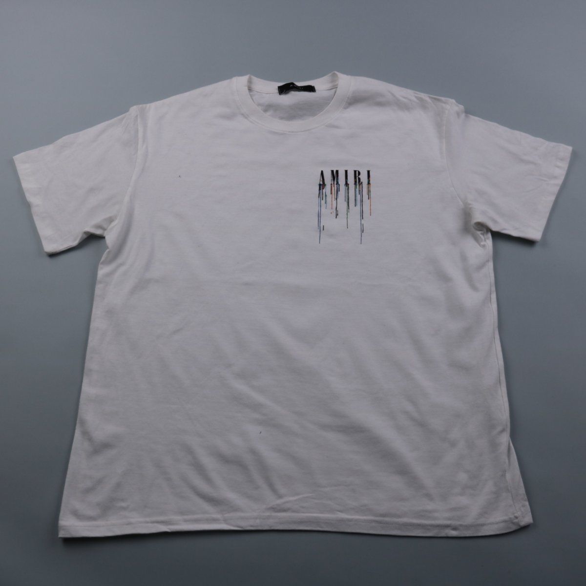 Мужская футболка AMIRI белого цвета с фирменным принтом «drip» на груди и крупной надписью на спине. Подойдёт для повседневных образов в тёплую погоду и как базовый слой под куртку/рубашку. Натуральный хлопок хорошо дышит и комфортен в носке.