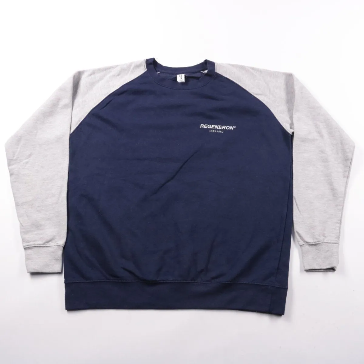 Свитшот Just Hoods (модель JH033) в стиле реглан: тёмно-синий корпус и серые рукава, небольшой принт Regeneron Ireland на груди. Подойдёт для повседневной носки и офиса в casual-формате, удобно носить слойно с футболкой. Практичный мягкий футер 80% хлопок/20% полиэстер хорошо держит форму и не требует сложного ухода.