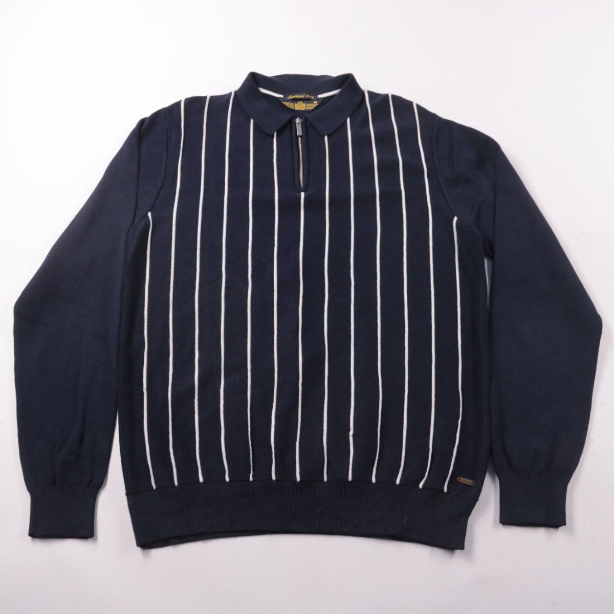 Мужской хлопковый джемпер Admiral с воротником-поло и короткой молнией. Тёмно-синий цвет с белыми вертикальными полосами подойдёт для повседневных образов в межсезонье. Практичен в носке: натуральный хлопок хорошо дышит и комфортен в помещении.