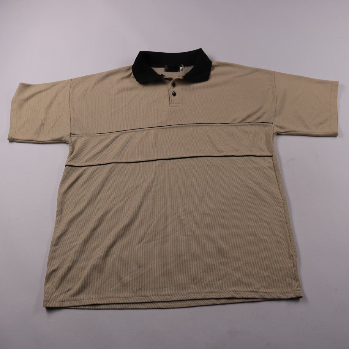 Мужское поло бежевого цвета с чёрным воротником и планкой на пуговицах. Подойдёт для повседневной носки летом и в тёплую погоду, хорошо смотрится с джинсами или шортами. Материал приятный к телу и удобен в уходе.