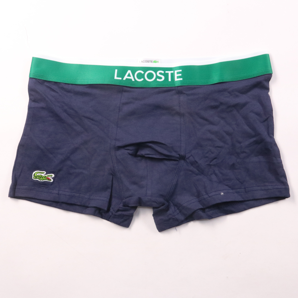 Мужские трусы-боксеры Lacoste тёмно-синего цвета с зелёной брендированной резинкой. Подойдут на каждый день и для поездок благодаря мягкой посадке и удобной длине штанин. Эластичный пояс хорошо держит форму и не сползает.