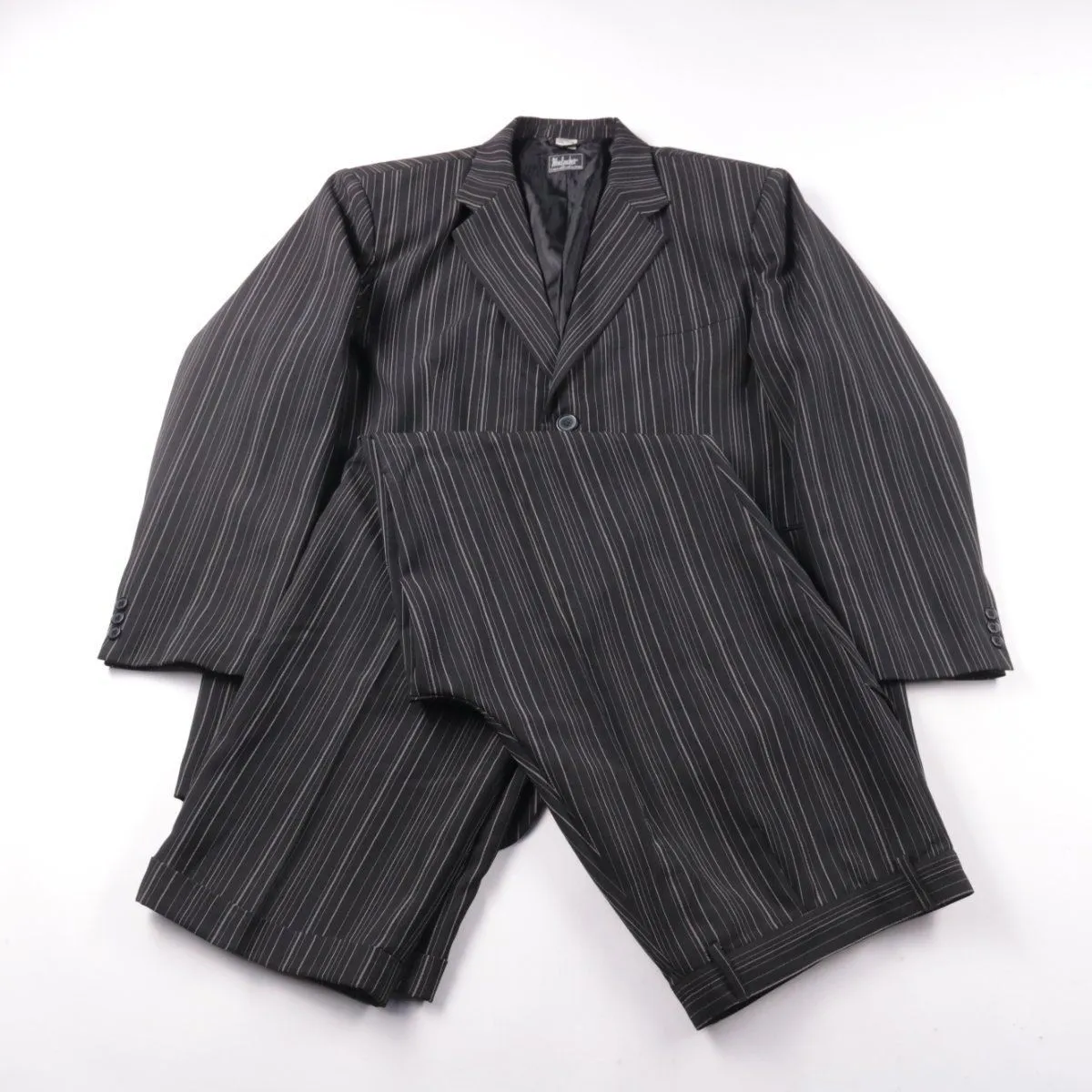 Мужской классический костюм в чёрном цвете с тонкой полоской: пиджак и брюки. Подойдёт для офиса и торжественных мероприятий, хорошо сочетается с однотонной рубашкой. Практичный полиэстер проще в уходе и меньше мнётся.