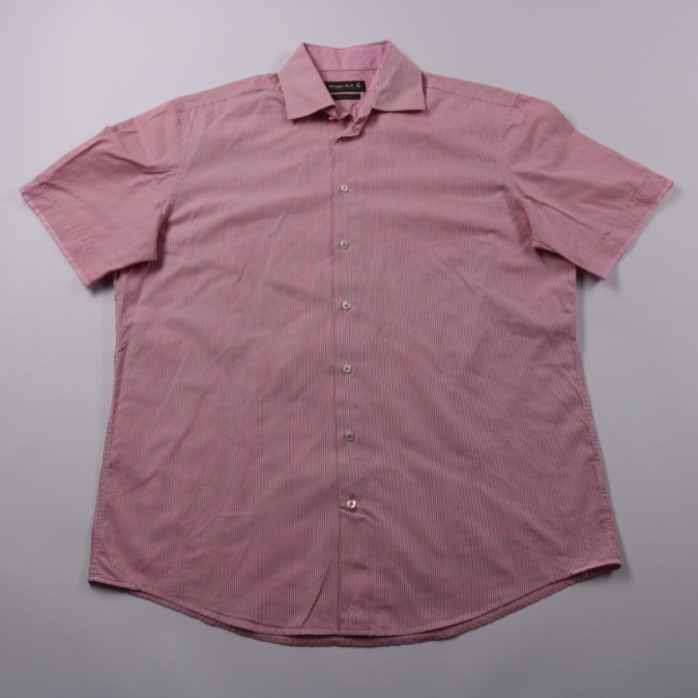Мужская рубашка Jacques Britt Custom Fit в розовую мелкую полоску, короткий рукав и классический воротник на пуговицах. Подойдёт для офиса и повседневных образов в тёплую погоду. Лёгкая ткань комфортно носится и хорошо сочетается с джинсами и брюками.