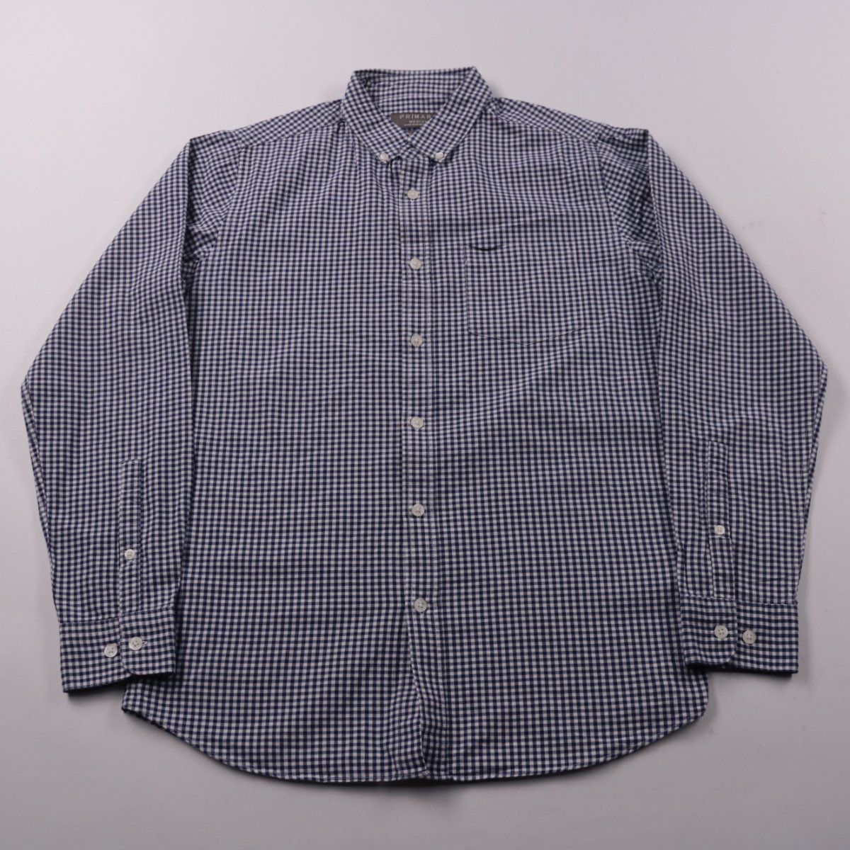 Мужская рубашка Primark Slim Fit в мелкую сине-белую клетку, с длинным рукавом и воротником на пуговицах. Подойдёт для офиса в стиле casual и на каждый день с джинсами или брюками. Натуральный хлопок хорошо дышит и комфортен в носке.