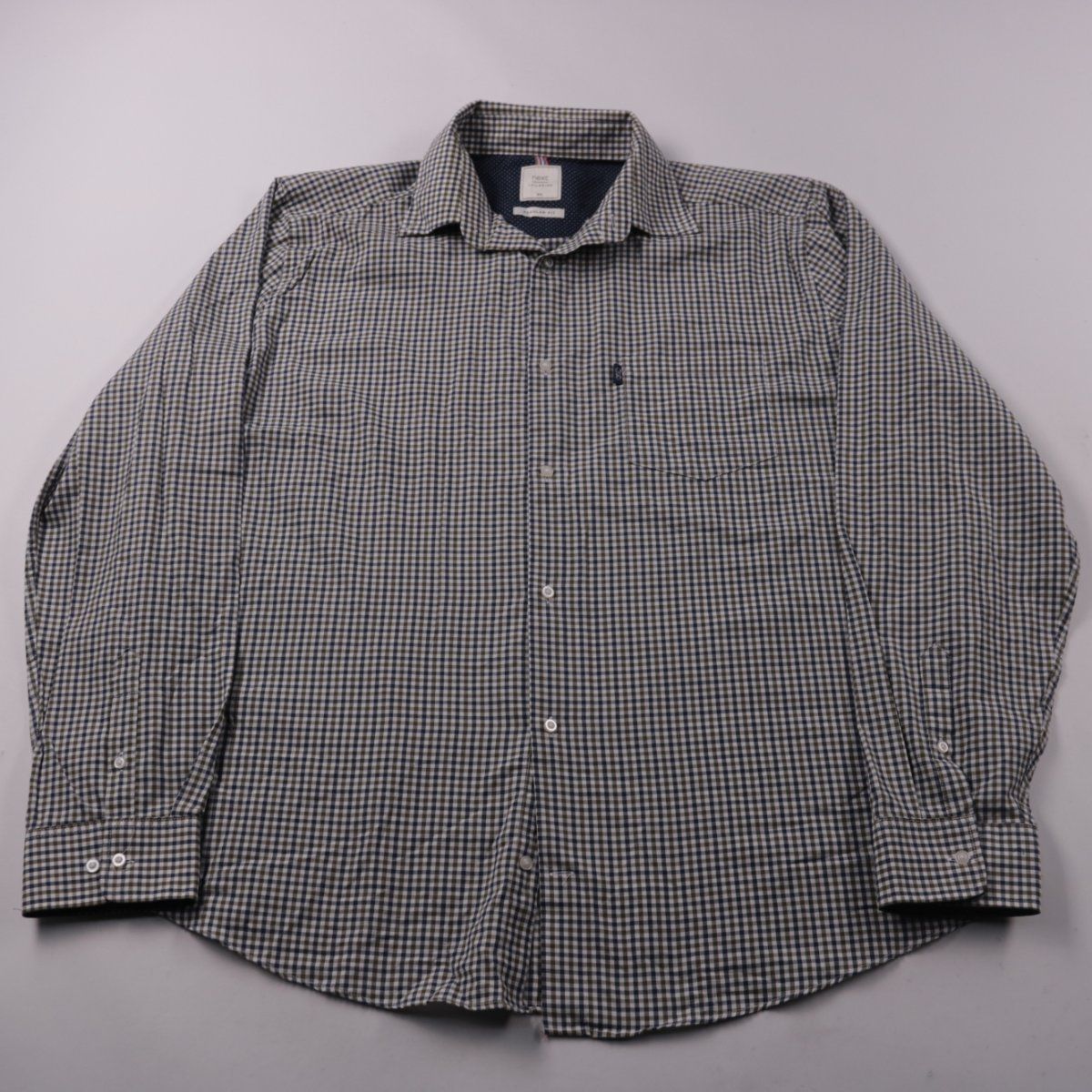 Мужская рубашка Next Tailoring Regular Fit в мелкую клетку, на пуговицах, с нагрудным карманом. Подойдёт для офиса и повседневной носки в любое время года, хорошо сочетается с джинсами и брюками. Смесь хлопка и полиэстера практична в уходе и меньше мнётся.
