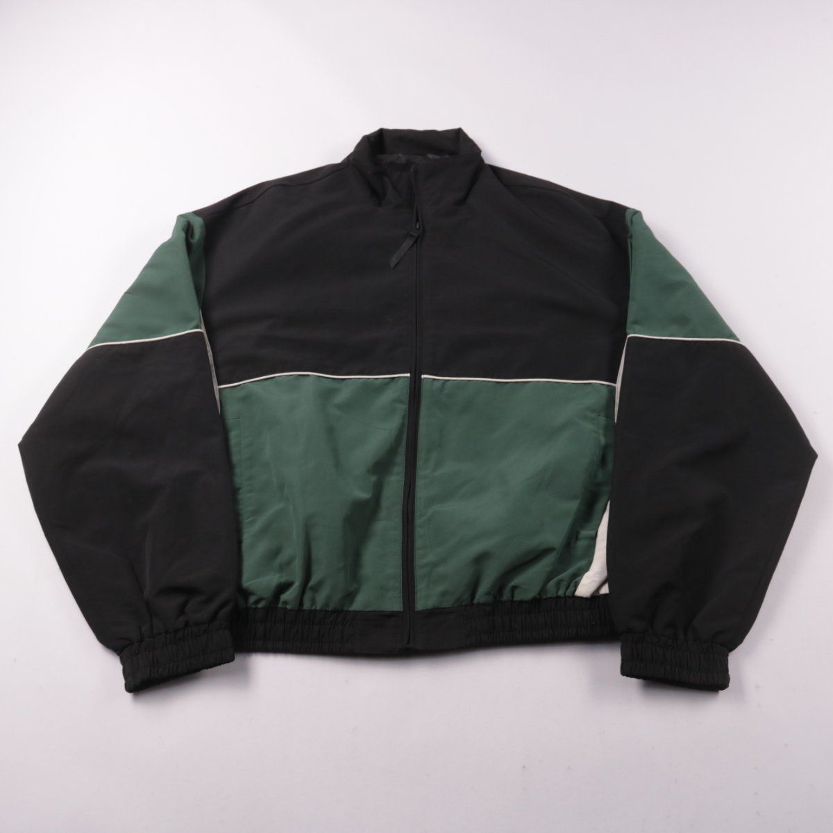Мужской бомбер без бренда, на молнии, с воротником-стойкой и эластичными манжетами/низом. Подойдёт для повседневной носки в демисезон, цветовой блок чёрный/зелёный с белыми вставками. Практичен тем, что ткань из полиэстера быстро сохнет и проста в уходе.