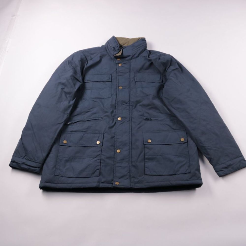 Мужская демисезонная куртка Pegasus тёмно-синего цвета с высоким воротником и застёжкой на кнопках. Модель с несколькими накладными карманами, подойдёт для повседневной носки в прохладную погоду. Практичный плюс — плотный полиэстер легко чистится и хор...